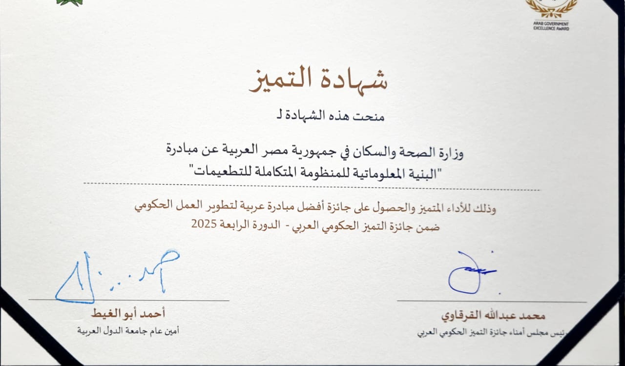 أعلنت وزارة الصحة والسكان، فوز قطاع الطب الوقائي والصحة العامة، بالمركز الأول في جائزة التميز الحكومي العربي (الدورة الرابعة 2025) عن فئة «أفضل مبادرة عربية لتطوير القطاع الحكومي»، وذلك تقديرًا لمشروع ميكنة منظومة التطعيمات الشاملة الذي يُعد نموذجًا رائدًا على المستويين الإقليمي والعالمي.