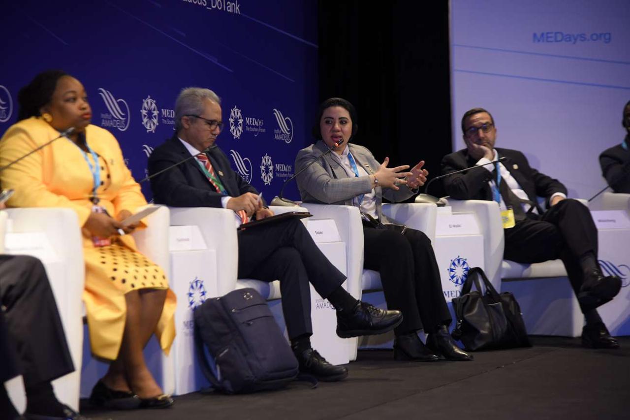 وفي المائدة المستديرة الخاصة بالهجرة و الأمن استعرضت الدور المصري المحوري في منطقة الشرق الأوسط و شمال افريقيا و قدرة مصر علي استيعاب موجات النزوح التي خلفتها الحروب و القلاقل في المنطقة و كيف استطاعت مصر دمج اللاجئين و المهاجرين في المجتمع برغم التحديات الاقتصادية والاجتماعية الجسيمة و اشارت الي التعديلات التشريعية المستمرة لحوكمة هذا الملف و الحاجة الماسة لمزيد من التنسيق الاقليمي الذي يتيح تبادل المعلومات الاستخباراتية وإدارة الحدود بشكل منسق و يمنع زعزعة الاستقرار يمنع عندما يفوق النزوح قدرة دولة واحدة خاصة في ضوء تحديات كبري ممثلة في التغيرات المناخية و فقر الأمن المائي و الغذائي و الصراعات حول الموارد في القارة