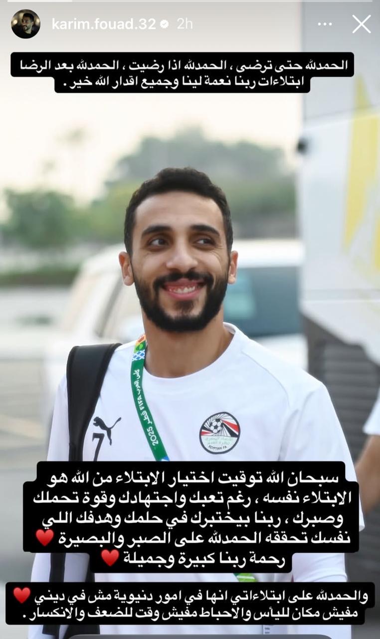 ونشر كريم فؤاد عبر حسابه علي انستجرام رسالة قال فيها:" الحمدلله حتى ترضي، الحمدلله إذا رضيت، الحمدلله بعد الرضا ابتلاءات ربنا نعمه لينا وجميع أقدار الله خير".