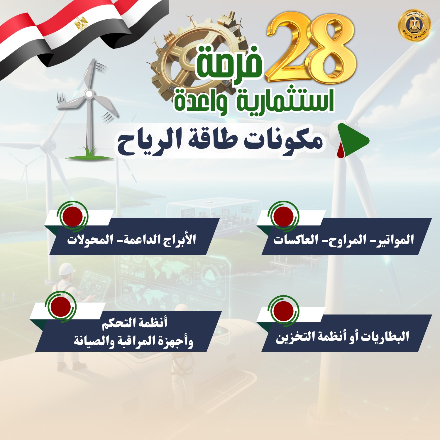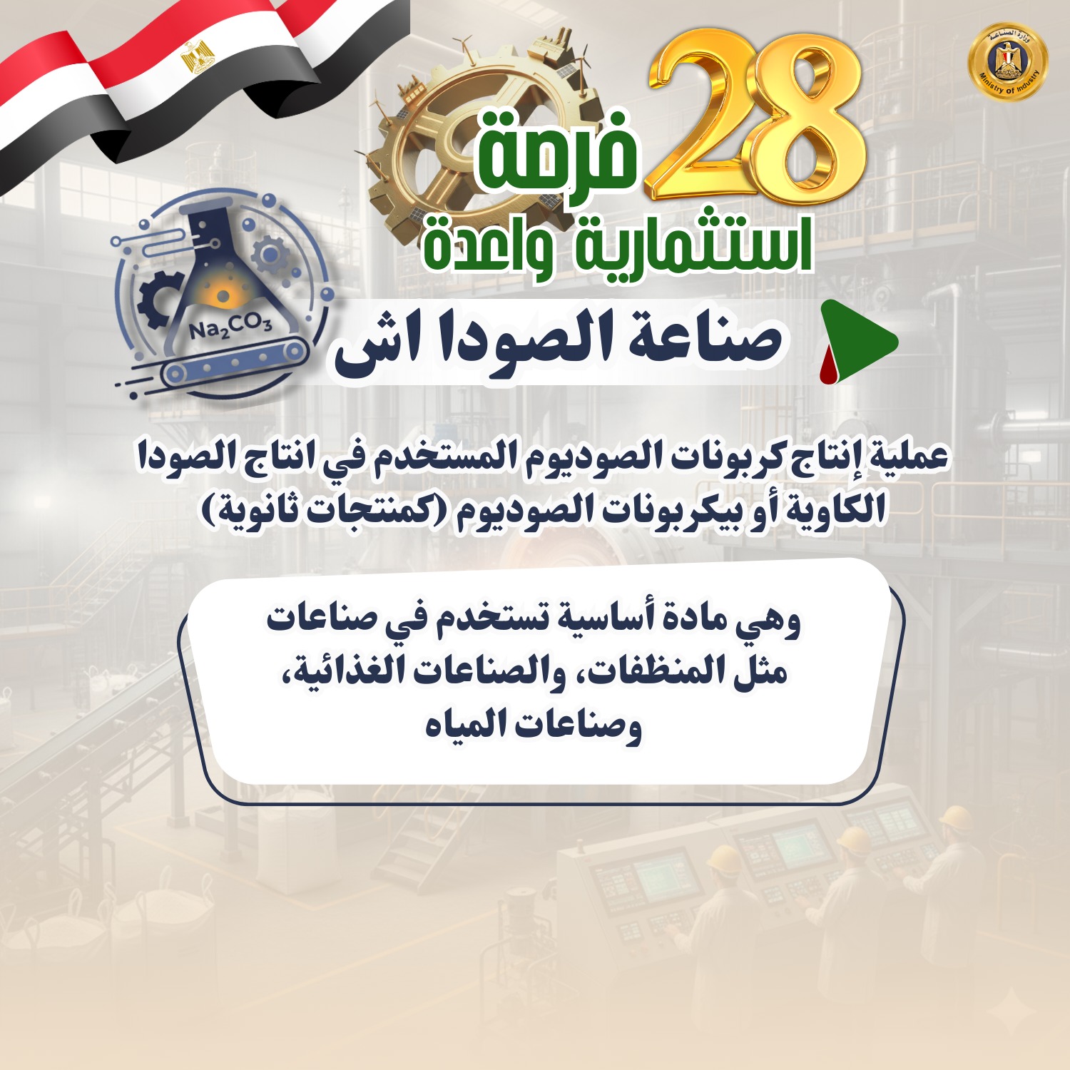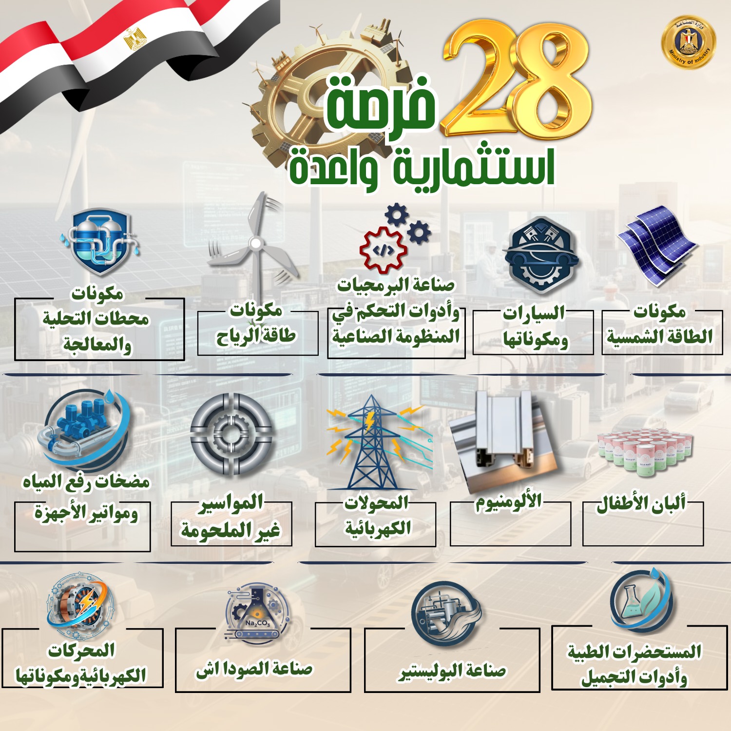 حددت وزارة الصناعة 28 صناعة وفرصة استثمارية واعدة ومستهدفة لجذب استثمارات بها بهدف تلبية احتياجات السوق، وتقليل فاتورة الواردات، وتدعو الوزارة المستثمرين الجادين لضخ استثمارات جديدة أو التوسع في هذه الصناعات الواعدة والمستهدفة التي توليها الوزارة اهتماماً بالغاً.