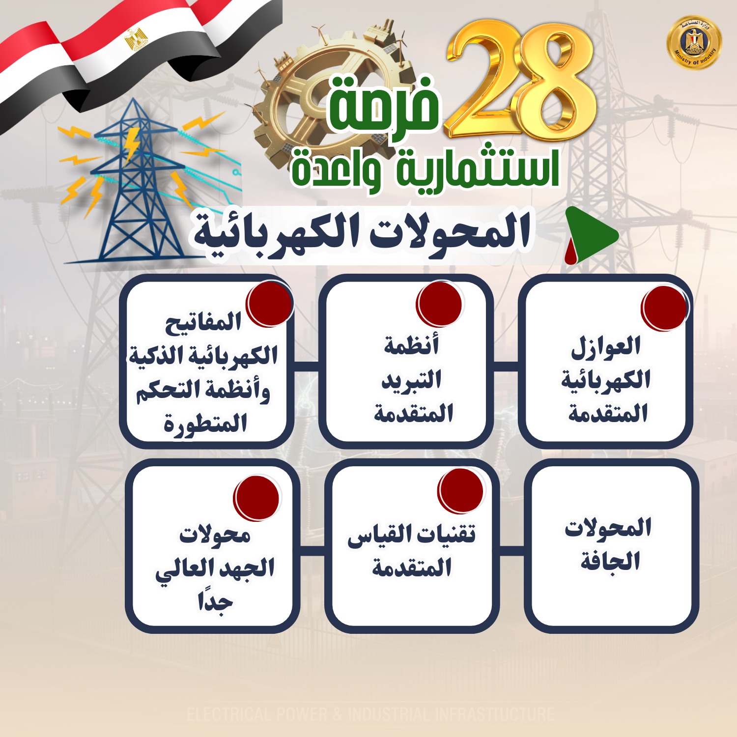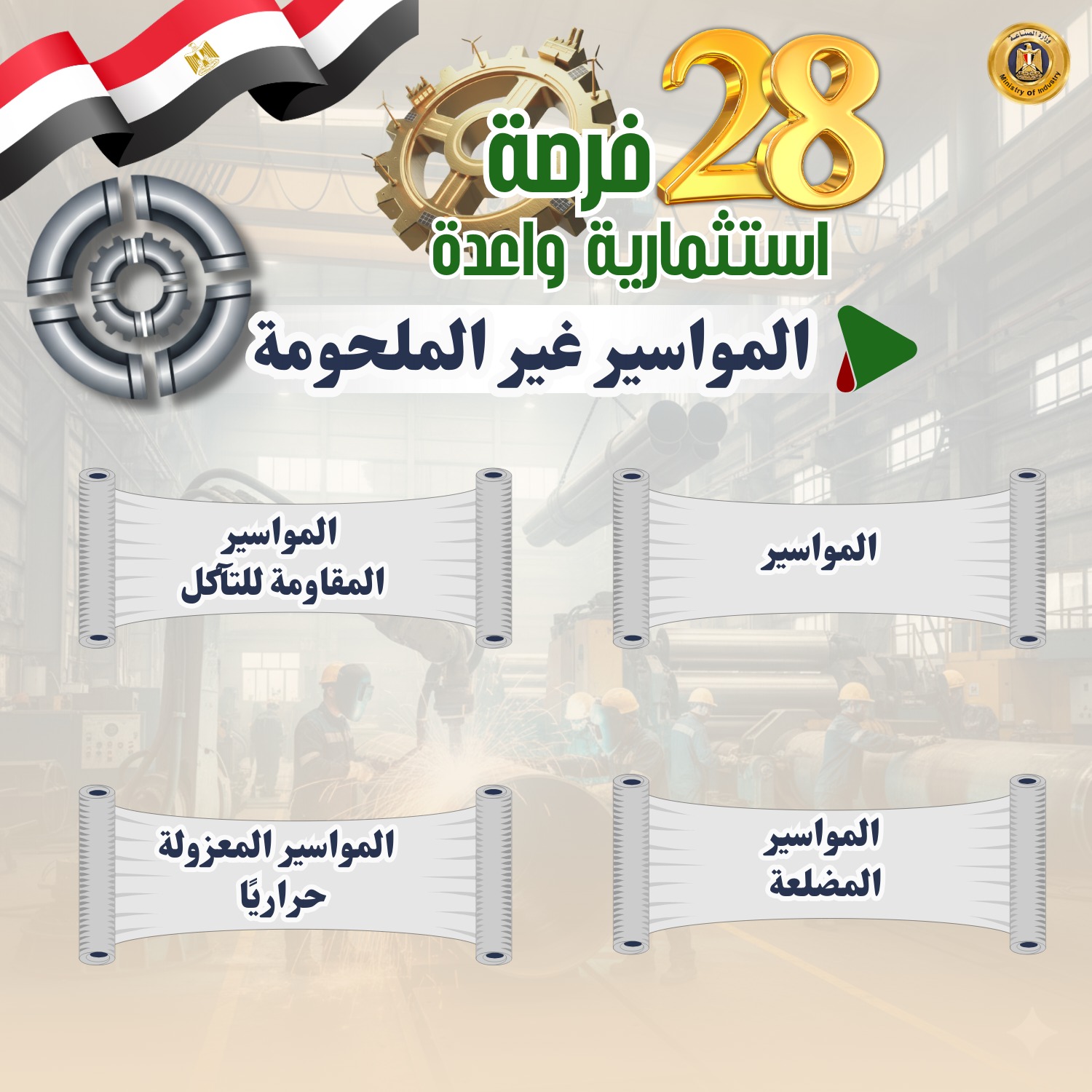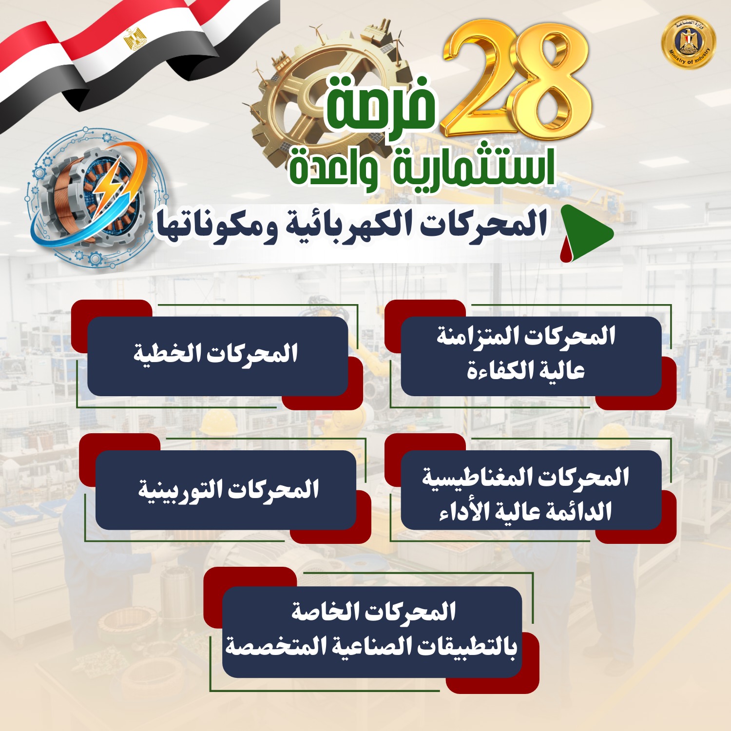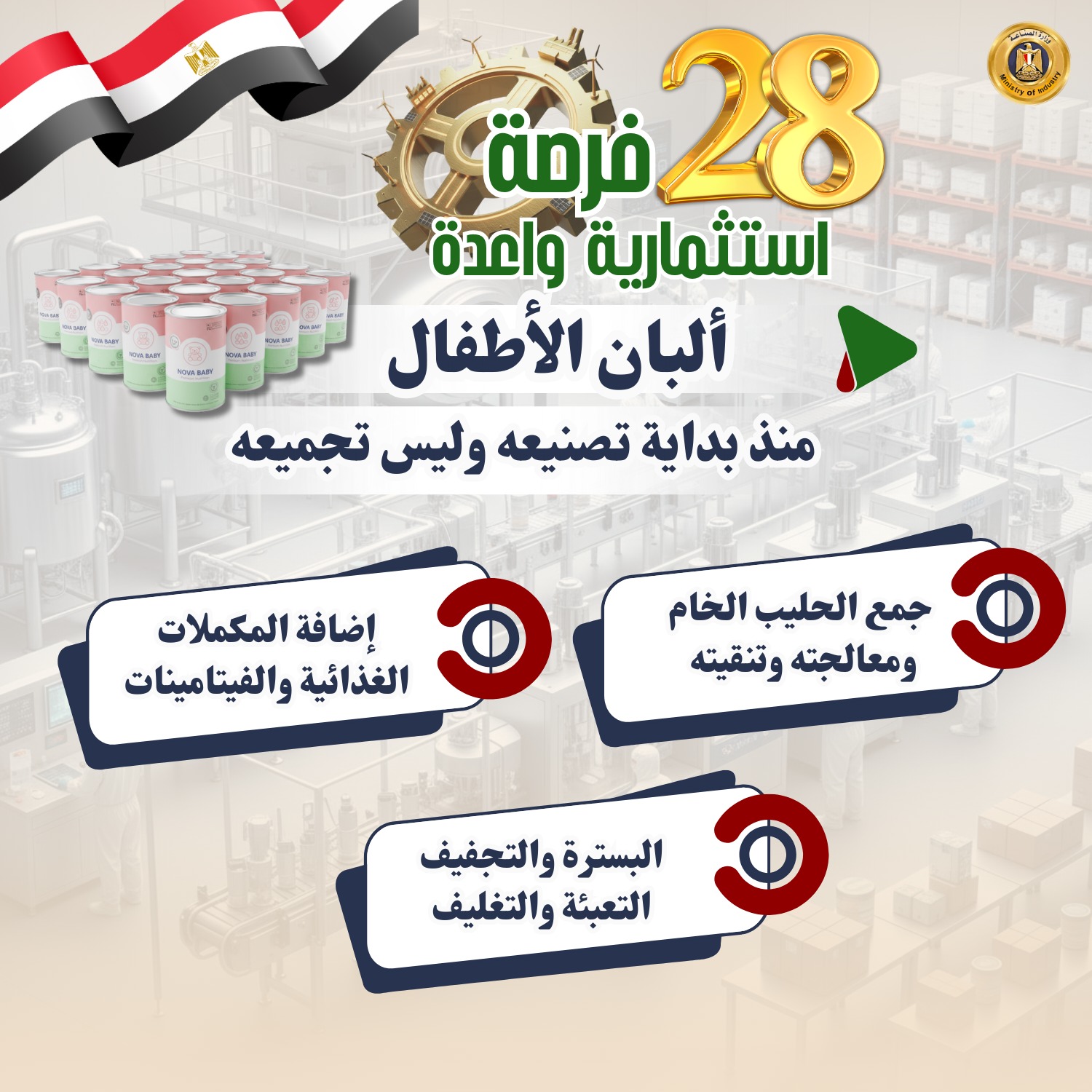 حددت وزارة الصناعة 28 صناعة وفرصة استثمارية واعدة ومستهدفة لجذب استثمارات بها بهدف تلبية احتياجات السوق، وتقليل فاتورة الواردات، وتدعو الوزارة المستثمرين الجادين لضخ استثمارات جديدة أو التوسع في هذه الصناعات الواعدة والمستهدفة التي توليها الوزارة اهتماماً بالغاً.
