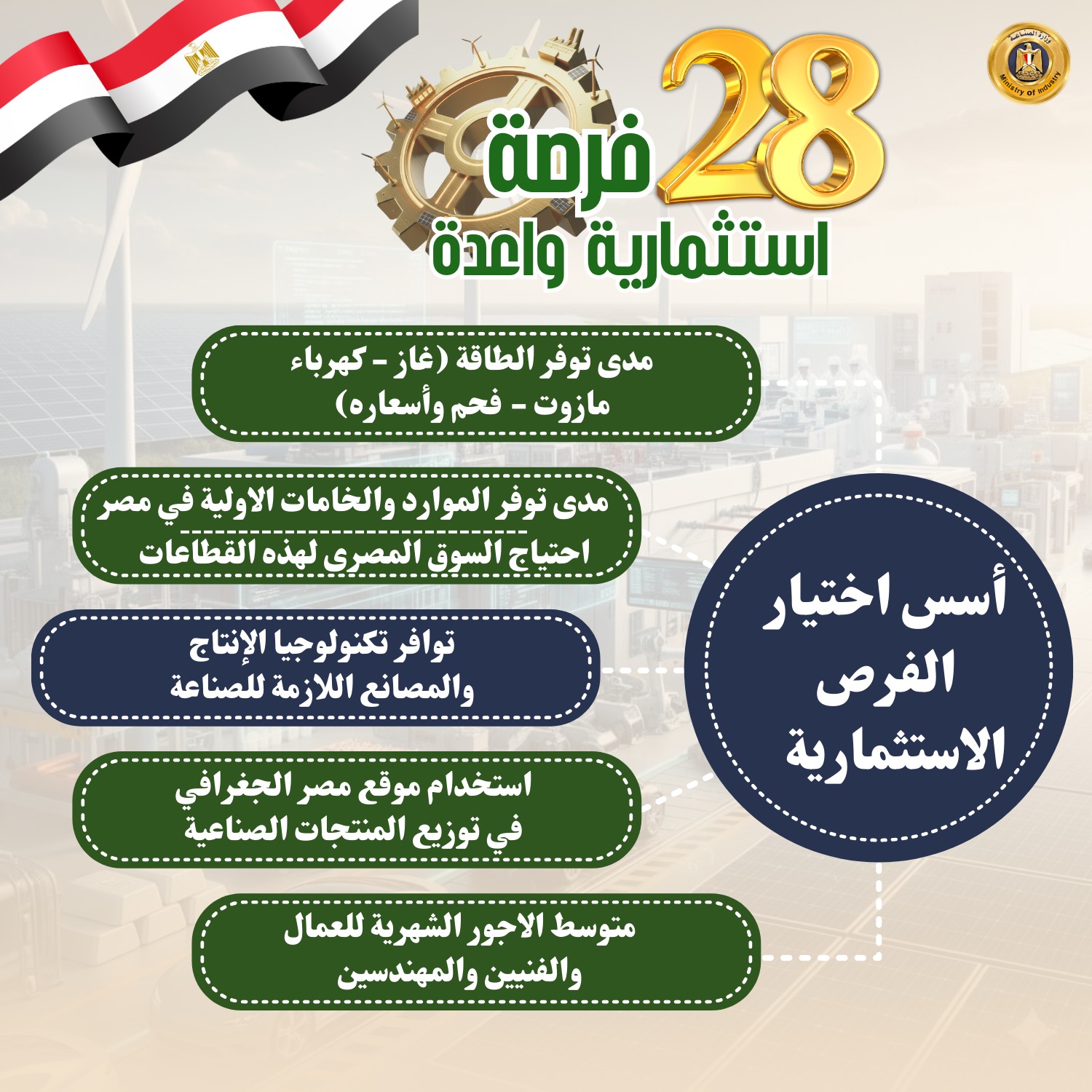 وتشمل الأسس المعايير التي تم بناءً عليها اختيار هذه الفرص تحديداً مدى توافر الطاقة (غاز - كهرباء - مازوت- فحم وأسعاره)، ومتوسط الأجور الشهرية للعمال والفنيين والمهندسين، وتوافر الموارد والخامات الاولية في مصر، إلى جانب توافر تكنولوجيا الإنتاج والمصانع اللازمة للصناعة، واحتياج السوق المصري لهذه الصناعات، فضلاً عن استخدام موقع مصر الجغرافي في توزيع المنتجات الصناعية.