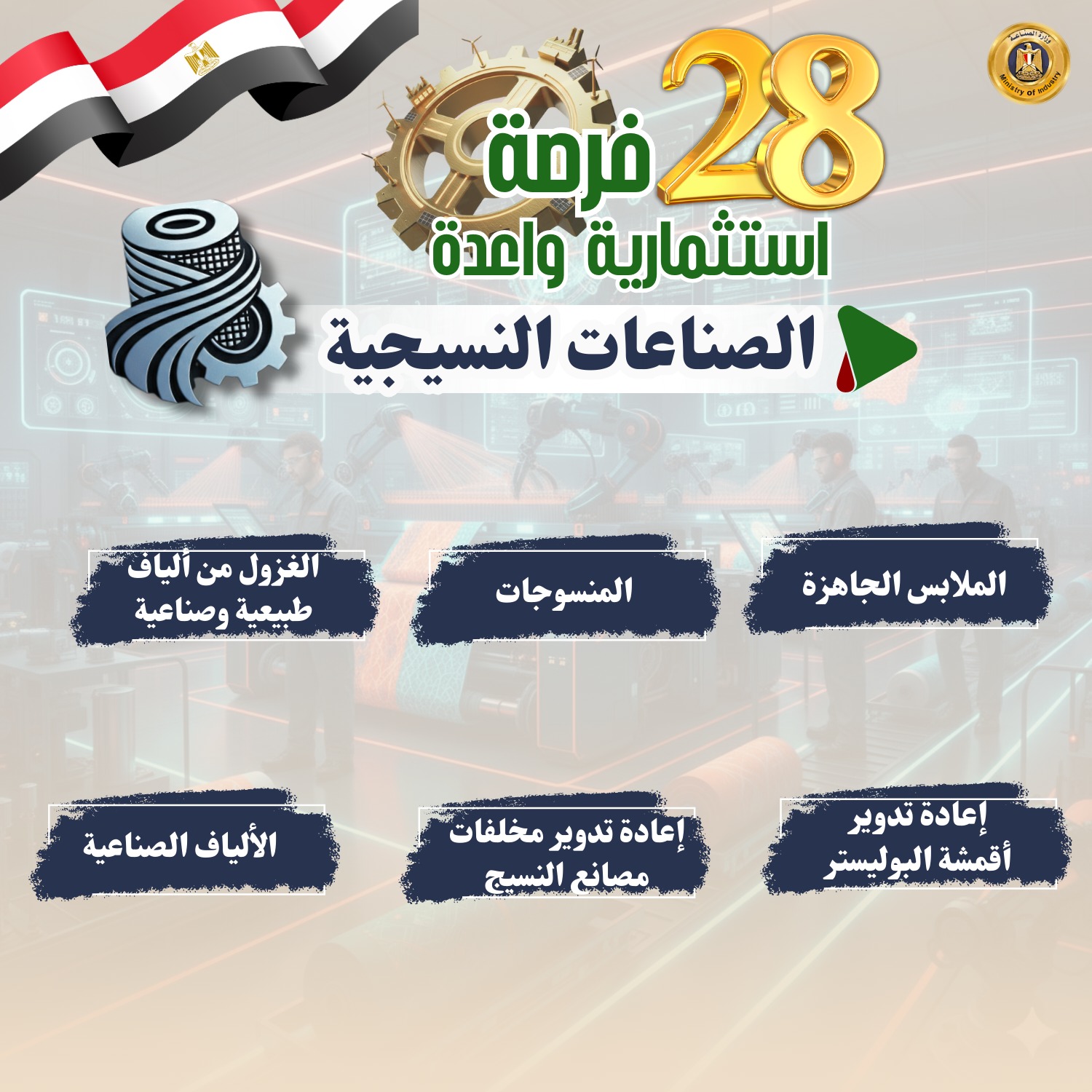 25- الصناعات النسيجية: تشمل الملابس الجاهزة، والمنسوجات، والغزول من ألياف طبيعية وصناعية، وإعادة تدوير أقمشة البوليستر، وإعادة تدوير مخلفات مصانع النسيج، والألياف الصناعية.
