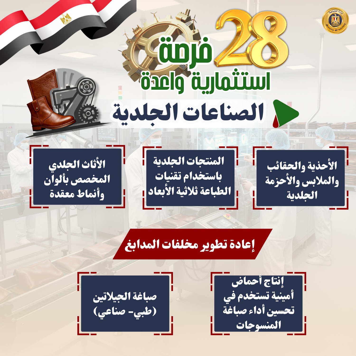 27- الصناعات الجلدية (الأحذية والحقائب والملابس والأحزمة الجلدية- المنتجات الجلدية باستخدام تقنيات الطباعة ثلاثية الأبعاد- الأثاث الجلدي المخصص بألوان وأنماط معقدة) وإعادة تطوير مخلفات المدابغ: لإنتاج أحماض أمينية تستخدم في تحسين أداء صباغة المنسوجات، وصباغة الجيلاتين (طبي- صناعي).