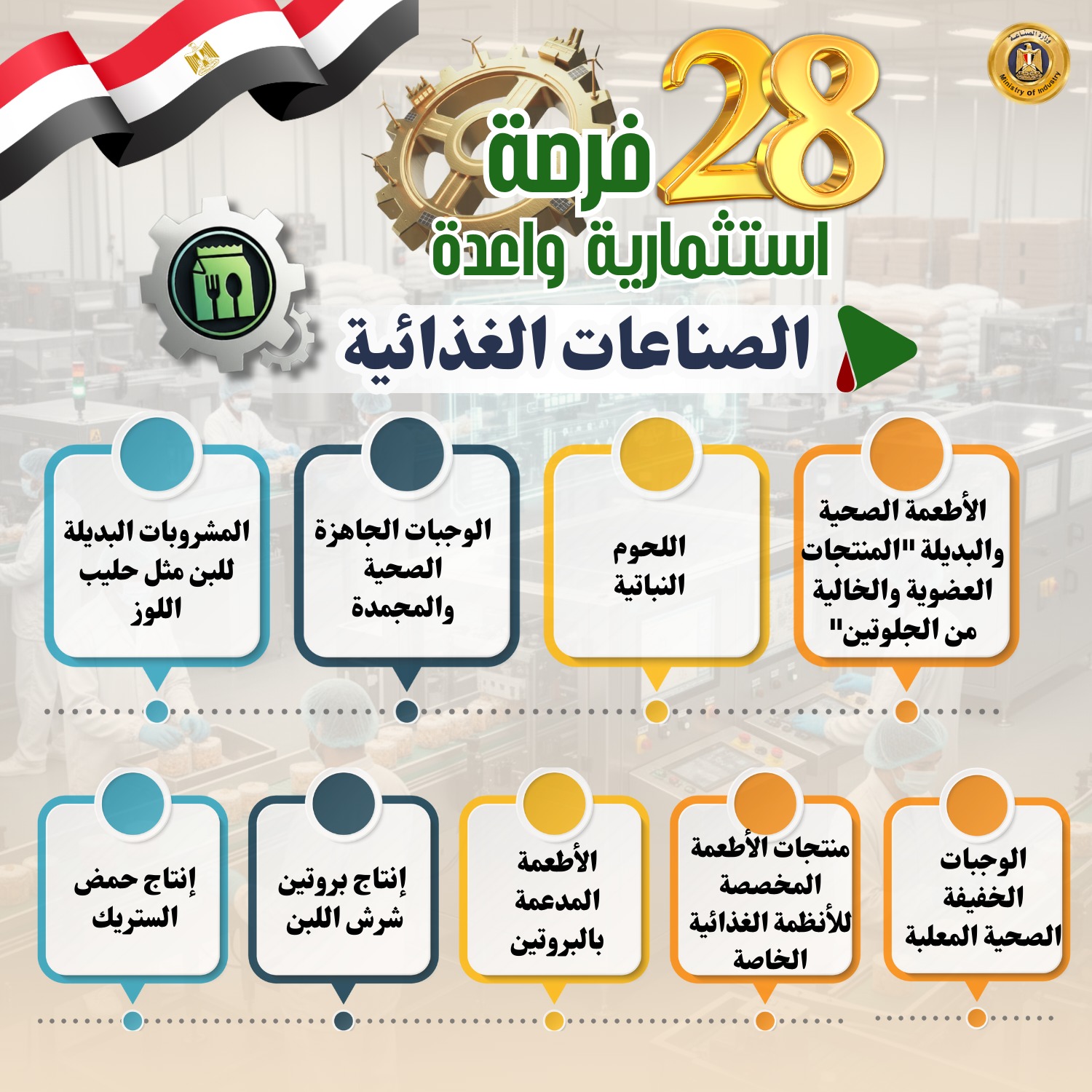 26- الصناعات الغذائية (الأطعمة الصحية والبديلة "المنتجات العضوية والخالية من الجلوتين"- اللحوم النباتية- الوجبات الجاهزة الصحية والمجمدة- المشروبات البديلة للبن مثل حليب اللوز- منتجات الأطعمة المخصصة للأنظمة الغذائية الخاصة- الوجبات الخفيفة الصحية المعلبة- الأطعمة المدعمة بالبروتين- إنتاج بروتين شرش اللبن- إنتاج حمض الستريك)
