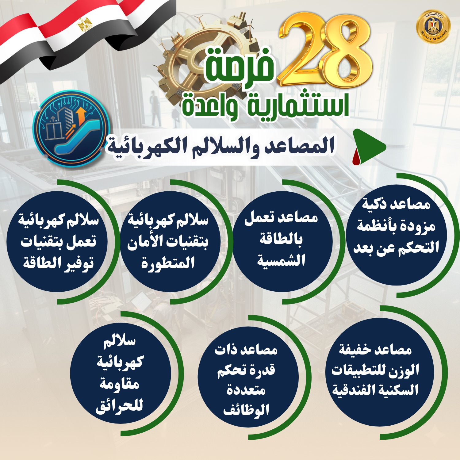 20- المصاعد والسلالم الكهربائية (مصاعد ذكية مزودة بأنظمة التحكم عن بعد- مصاعد تعمل بالطاقة الشمسية- سلالم كهربائية بتقنيات الأمان المتطورة- سلالم كهربائية تعمل بتقنيات توفير الطاقة- مصاعد خفيفة الوزن للتطبيقات السكنية الفندقية- مصاعد ذات قدرة تحكم متعددة الوظائف- سلالم كهربائية مقاومة للحرائق)