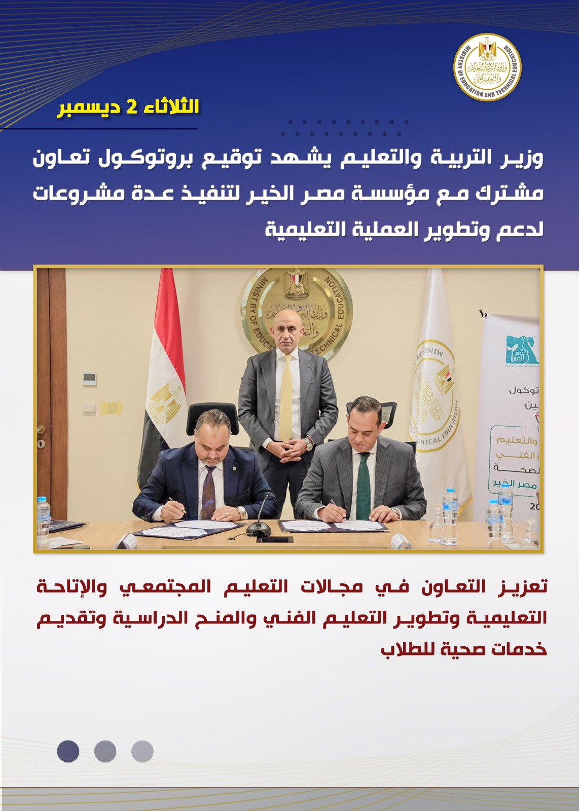 وفي ختام التقرير الأسبوعي، شهد الوزير توقيع بروتوكول تعاون بين الوزارة ومؤسسة «مصر الخير» لدعم وتطوير منظومة التعليم في مجالات التعليم الفني والعام والمجتمعي، إضافة إلى تقديم المنح الدراسية ومحو الأمية وتحسين الخدمات الصحية. وأكد الوزير أن التعاون مع مؤسسات المجتمع المدني يمثل نموذجاً يُحتذى به، فيما أعرب الدكتور محمد رفاعي الرئيس التنفيذي لمؤسسة «مصر الخير» عن سعادته بتوقيع البروتوكول ودعمه الكامل لجهود تطوير التعليم في مصر.