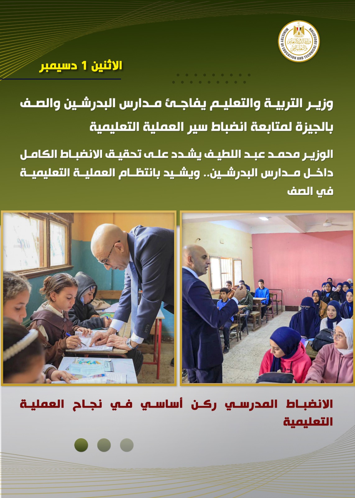 وفي محافظة الجيزة، واصل الوزير جولاته المفاجئة بمدارس البدرشين والصف، حيث تفقد سجلات الحضور والغياب وتقييمات الطلاب داخل مدارس الشهيد محمد أبو زيد الثانوية بنات، والشهيد العميد عاطف الإسلامبولي الإعدادية بنين، والبدرشين الجديدة الابتدائية. وشدد الوزير على ضرورة الالتزام بالحضور وتحقيق الانضباط الكامل داخل المدارس. كما تفقد الوزير مدرستي الأخصاص الابتدائية والثانوية بإدارة الصف، ووجّه بتشكيل لجنة من هيئة الأبنية التعليمية لبحث إمكانية التوسع وإنشاء مبنى جديد لاستيعاب الأعداد المتزايدة. وخلال لقائه بطلاب الصف الأول الثانوي، تحدث الوزير عن نظام البكالوريا المصرية ومادة البرمجة والذكاء الاصطناعي، مشيداً بالتزام الطلاب وانتظام حضورهم.