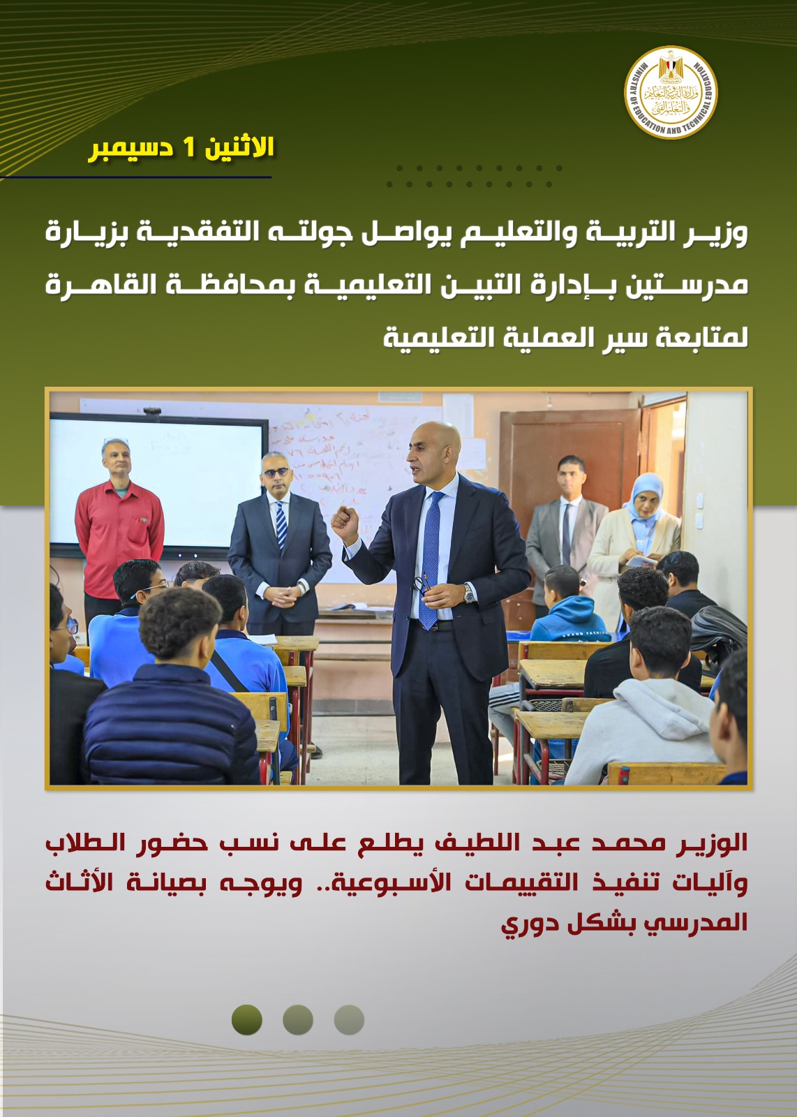 أصدر المركز الإعلامي لوزارة التربية والتعليم والتعليم الفني التقرير الأسبوعي للوزارة، حيث واصل محمد عبد اللطيف وزير التربية والتعليم والتعليم الفني جولاته المفاجئة بعدد من مدارس المحافظات لمتابعة انتظام العملية التعليمية وضبط الانضباط داخل المدارس.