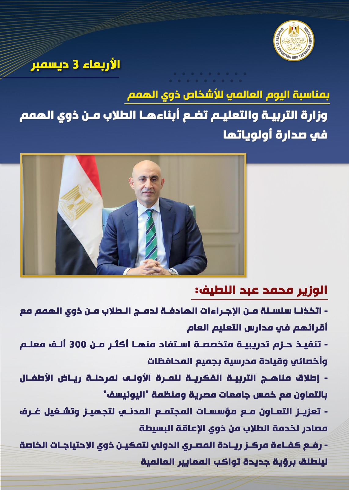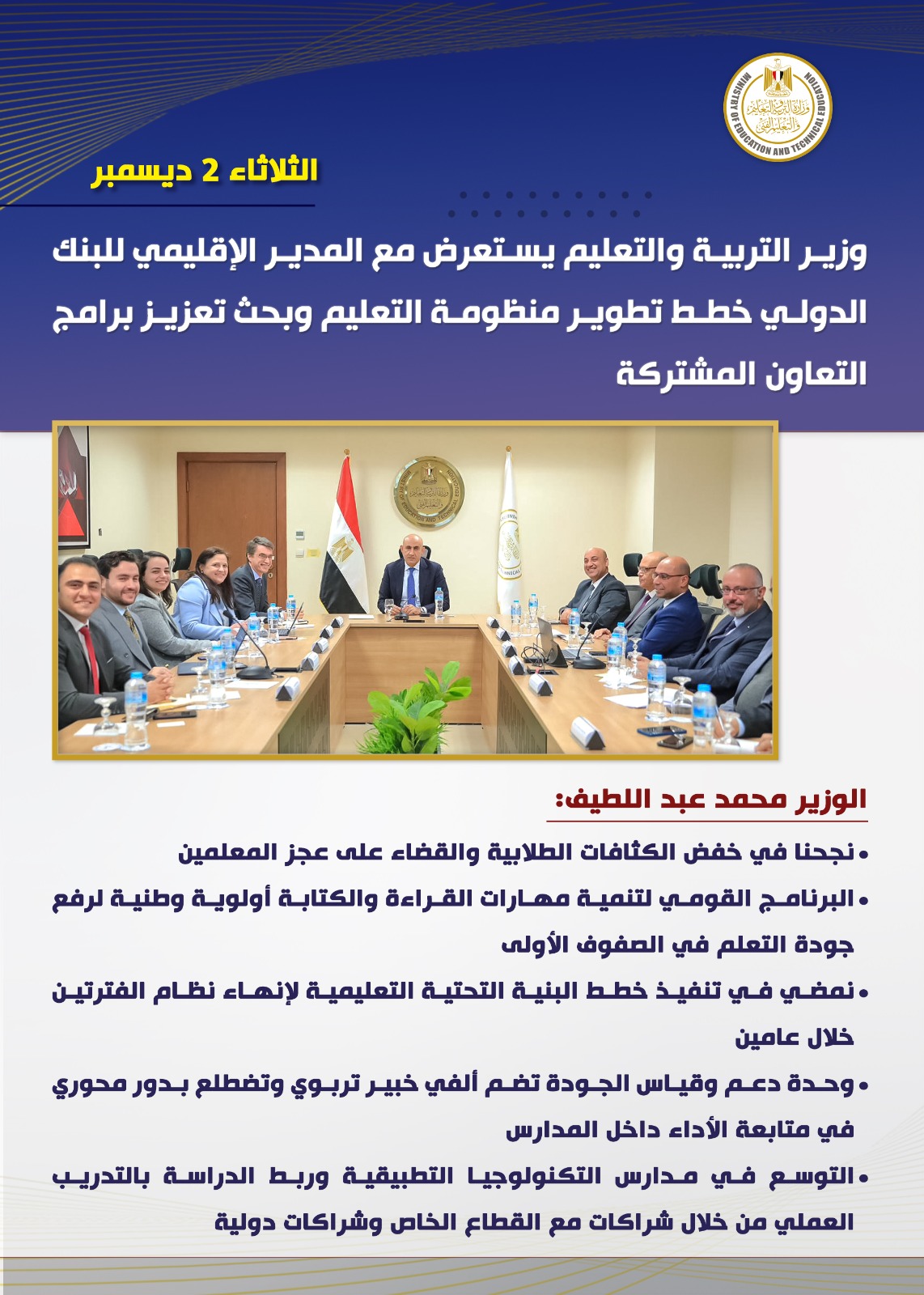 وفي إطار التعاون الدولي أيضاً، استقبل الوزير ستيفان جيمبرت المدير الإقليمي للبنك الدولي، حيث استعرض جهود الوزارة في خفض الكثافات الطلابية، وتطوير المناهج، وإدراج مادة البرمجة والذكاء الاصطناعي، وتوسيع برامج تنمية مهارات القراءة والكتابة، وتنفيذ خطة إنهاء نظام الفترتين خلال عامين. كما تطرق الوزير إلى تطوير التعليم الفني والتوسع في مدارس التكنولوجيا التطبيقية، مستعرضاً البروتوكول الموقع مع الجانب الإيطالي لإنشاء ٨٩ مدرسة تكنولوجية جديدة. وأعرب جيمبرت عن تقديره لما تحقق من تقدم في المنظومة التعليمية، مؤكداً استمرار دعم البنك الدولي لمشروعات التطوير.
