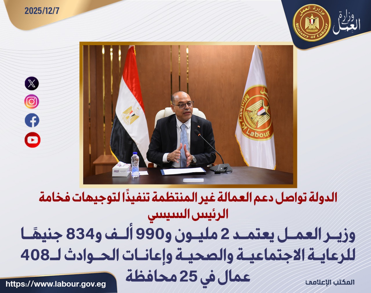 الدولة تواصل دعم العمالة غير المنتظمة.. وزير العمل يعتمد 2 مليون جنيه للرعاية الاجتماعية والصحية