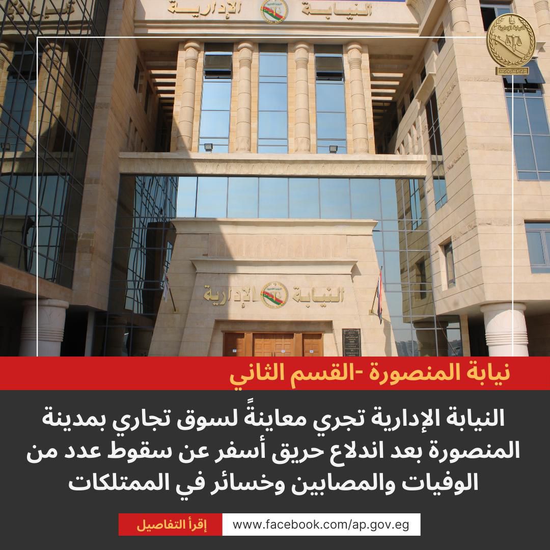 تنفيذًا لتكليفات المستشارمحمد الشناوي رئيس هيئة النيابة الإدارية، وفي ضوء ما رصده مركز الإعلام والرصد من واقعة اندلاع حريق بسوق تجاري ومخزن ملابس كائن بشارع الخواجات المتفرع من شارع بورسعيد بمدينة المنصورة؛ مساء يوم الثالث من ديسمبر الجاري؛ والذي أسفر عن احتراقه بالكامل، وسقوط عددٍ من الوفيات والمصابين