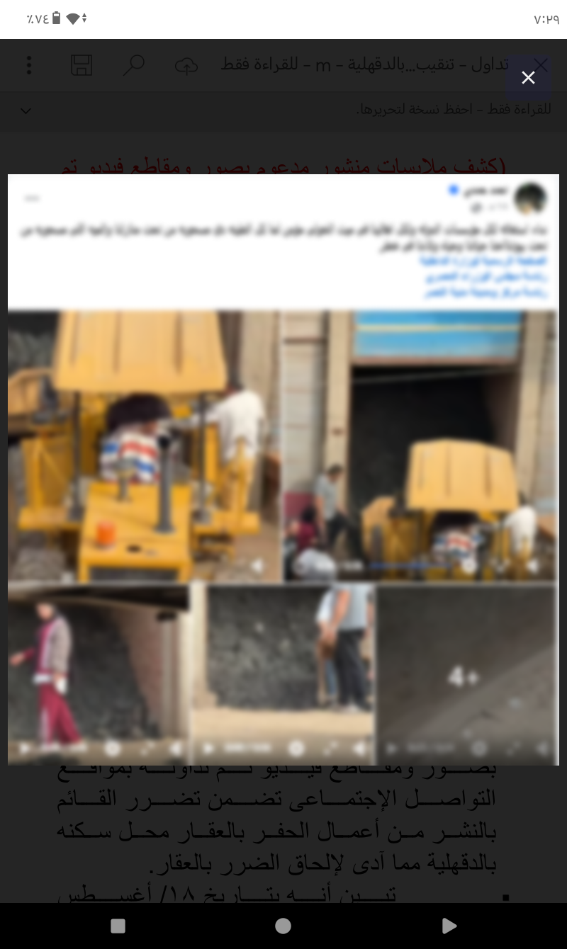 رصدت أجهزة الأمن، منشورا مدعوما بصور ومقاطع فيديو تم تداوله بمواقع التواصل الاجتماعى تضمن تضرر القائم بالنشر من أعمال الحفر بالعقار محل سكنه بالدقهلية، مما أدى لإلحاق الضرر بالعقار.