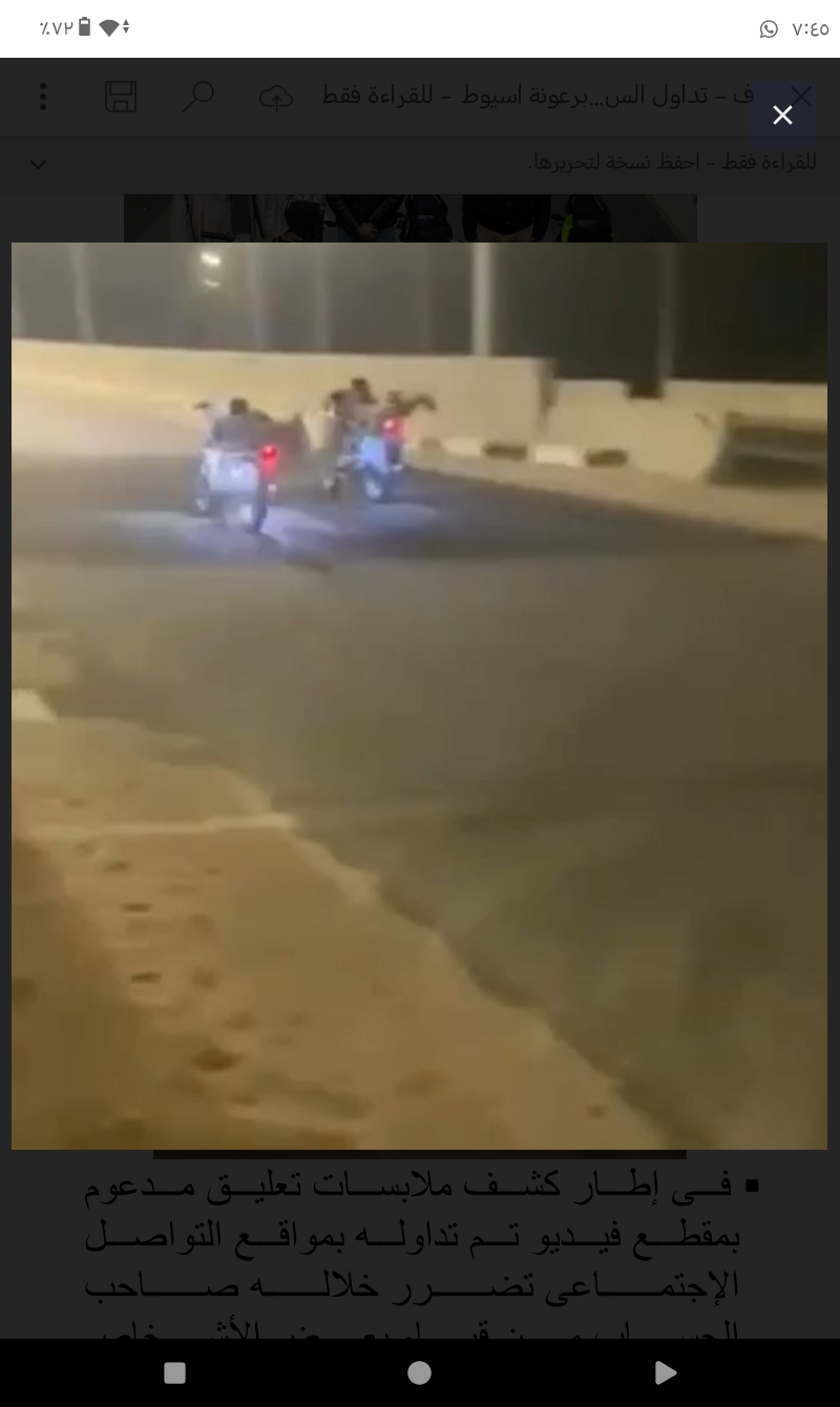 تمكنت قوات الأمن من تحديد وضبط الدراجات النارية الظاهرة بمقطع الفيديو، وكانت "بدون لوحات"، وقائديها "لا يحملون رخص قيادة"، وهم 3 أشخاص، يقيمون بدائرة مركز شرطة ديروط.