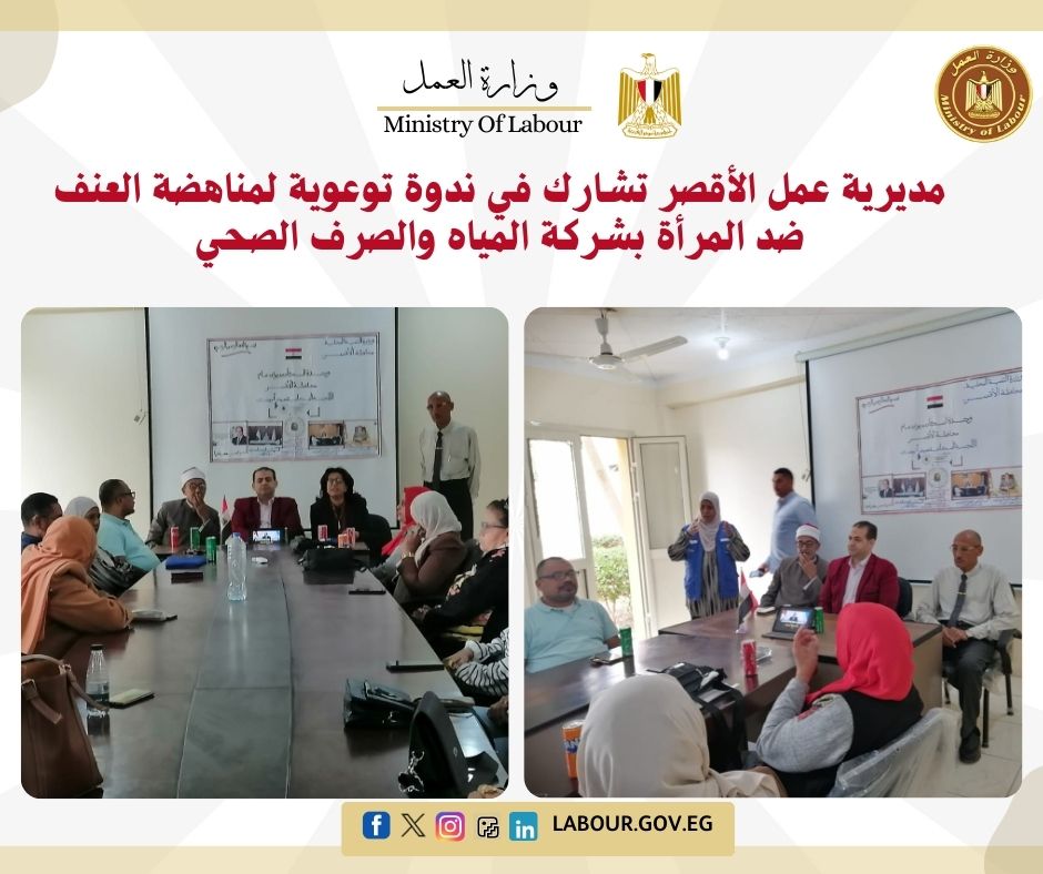 5- مديرية عمل الأقصر تشارك في ندوة توعوية لمناهضة العنف ضد المرأة بشركة المياه والصرف الصحي