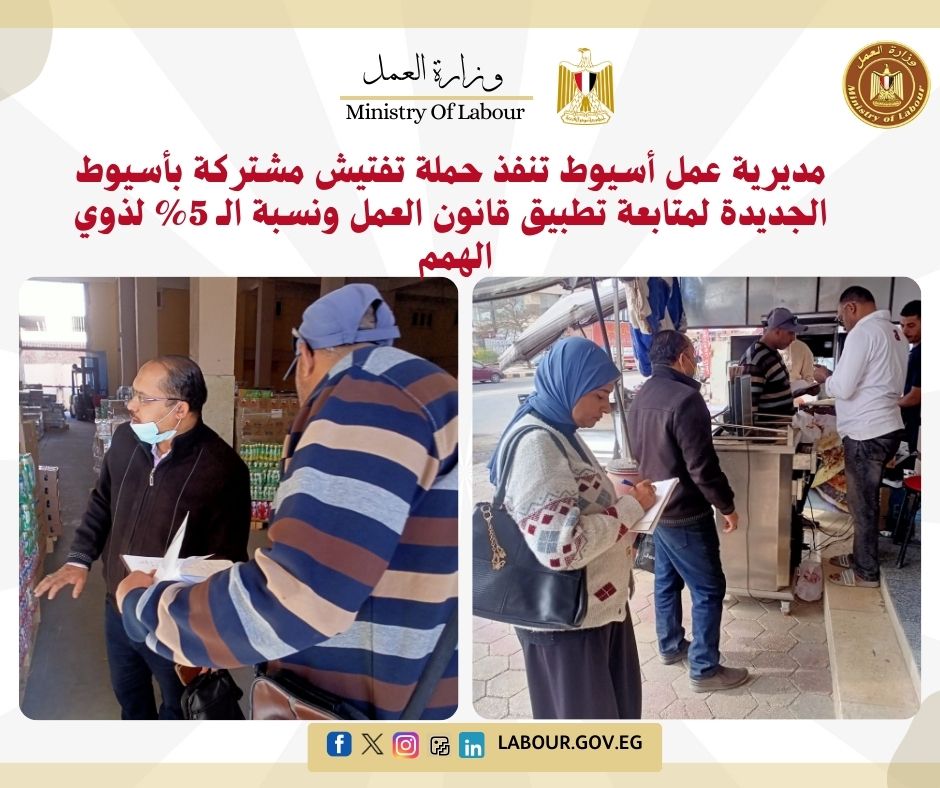 10- مديرية عمل أسيوط تنفذ حملة تفتيش مشتركة بأسيوط الجديدة لمتابعة تطبيق قانون العمل ونسبة الـ 5% لذوي الهمم