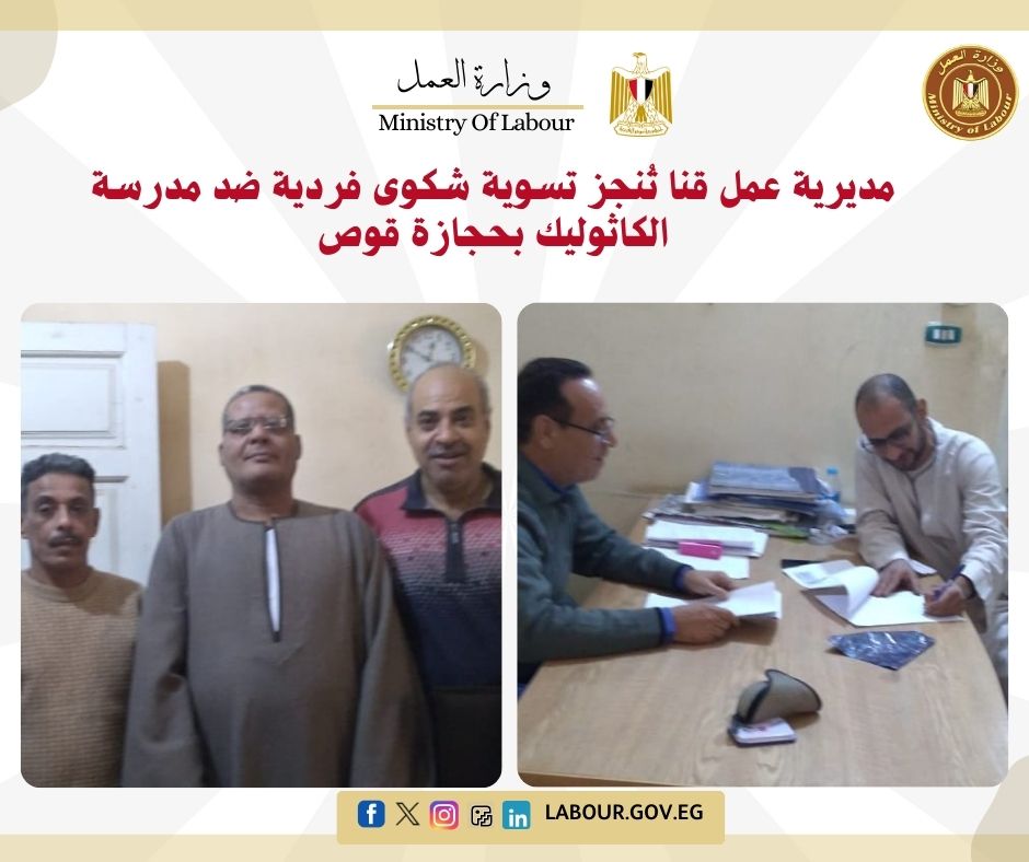 7- مديرية عمل قنا تُنجز تسوية شكوى فردية ضد مدرسة الكاثوليك بحجازة قوص