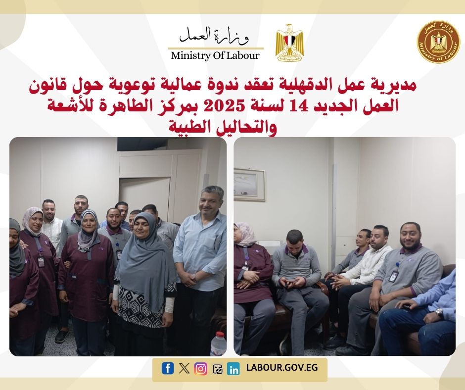 8- مديرية عمل الدقهلية تعقد ندوة عمالية توعوية حول قانون العمل الجديد 14 لسنة 2025 بمركز الطاهرة للأشعة والتحاليل الطبية