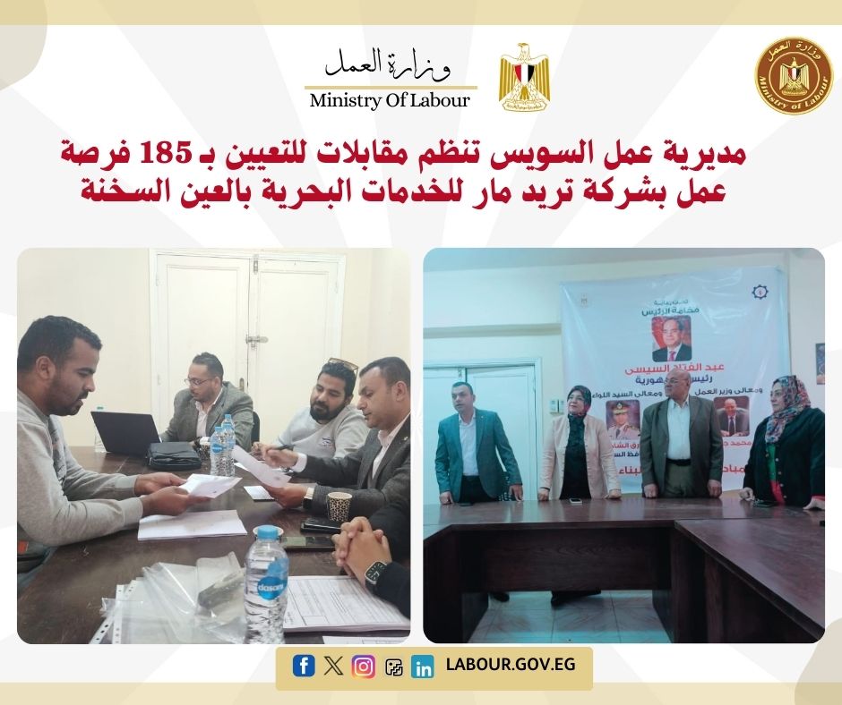 6- مديرية عمل السويس تنظم مقابلات للتعيين بـ 185 فرصة عمل بشركة تريد مار للخدمات البحرية بالعين السخنة