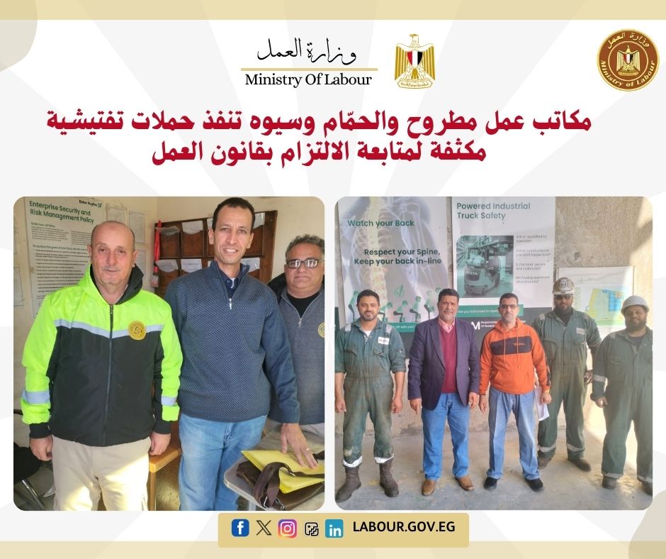 4- مكاتب عمل مطروح والحمّام وسيوه تنفذ حملات تفتيشية مكثفة لمتابعة الالتزام بقانون العمل..