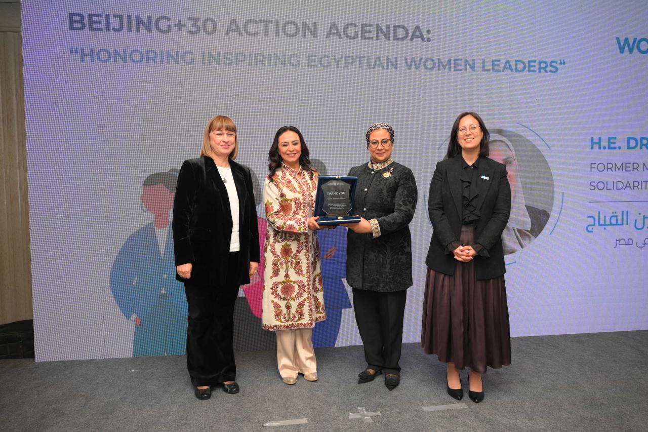 كرمت هيئة الأمم المتحدة للمرأة في مصر الدكتورة نيفين القباج وزيرة التضامن الاجتماعي السابقة تقديراً لمجهوداتها خلال الفترة السابقة، وذلك خلال فعالية " أجندة بكين +30 .. تكريم القيادات النسائية المصرية الملهمة"، والتي تأتي بالتزامن مع الاحتفال بالذكرى الـ30 للمؤتمر العالمي الرابع للمرأة.