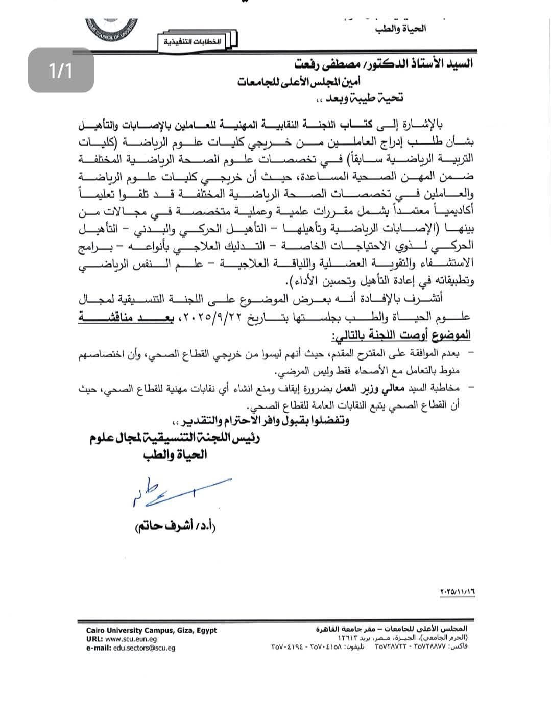 أعلن الدكتور سامي سعد، النقيب العام للعلاج الطبيعي، عن صدور قرارا من اللجنة التنسيقية لمجال علوم الحياة والطب بالمجلس الأعلى للجامعات، برئاسة الدكتور أشرف حاتم رئيس لجنة الصحة بمجلس النواب، يقضي برفض طلب "اللجنة النقابية المهنية للعاملين بالإصابات والتأهيل" بشأن إدراج خريجي كليات علوم الرياضة (التربية الرياضية سابقا) ضمن المهن الصحية المساعدة.