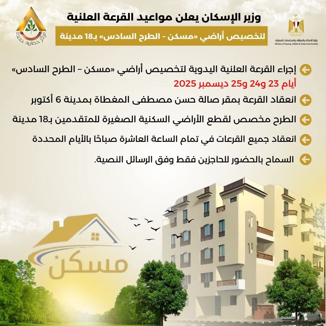 سيتم يوم الثلاثاء ٢٣ / ١٢ / ٢٠٢٥ إجراء القرعة للمتقدمين على أراضي الإسكان الأكثر تميزاً بمدن ( 6 أكتوبر – العبور – العاشر من رمضان )، وللمتقدمين لحجز أراضي الإسكان المميز بمدن (أخميم الجديدة – الصالحية الجديدة - الفشن الجديدة - الفيوم الجديدة - المنيا الجديدة - بدر - طيبة الجديدة ).