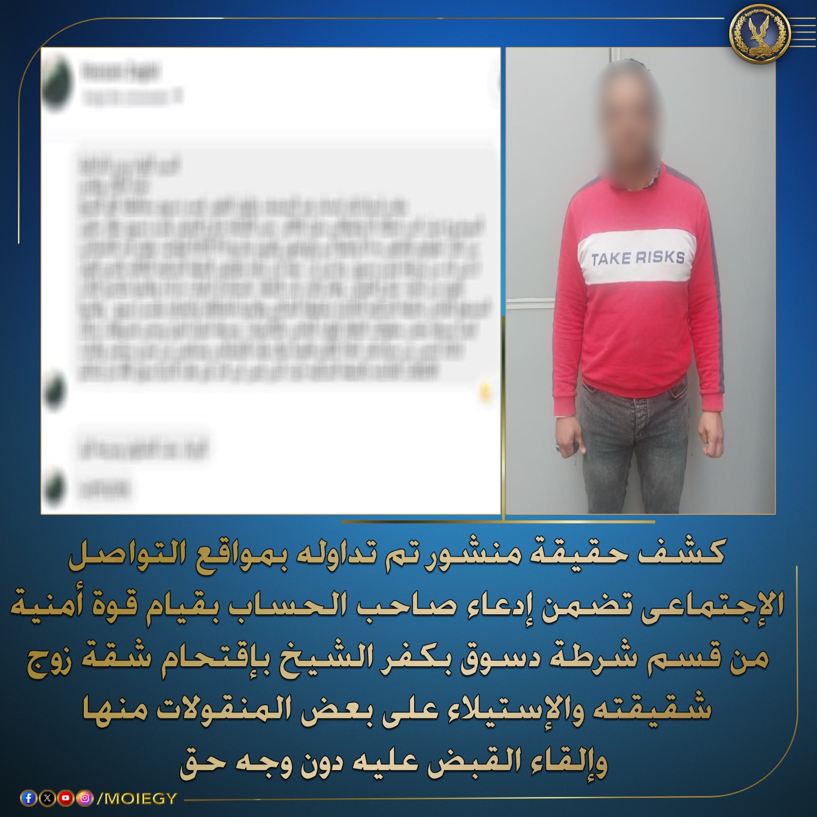 نجحت الأجهزة الامنية ، بوزارة الداخلية ، في كشف حقيقة منشور تم تداوله بمواقع التواصل الإجتماعى تضمن إدعاء صاحب الحساب بقيام قوة أمنية من قسم شرطة دسوق بكفر الشيخ بإقتحام شقة زوج شقيقته والإستيلاء على بعض المنقولات منها وإلقاء القبض عليه دون وجه حق.