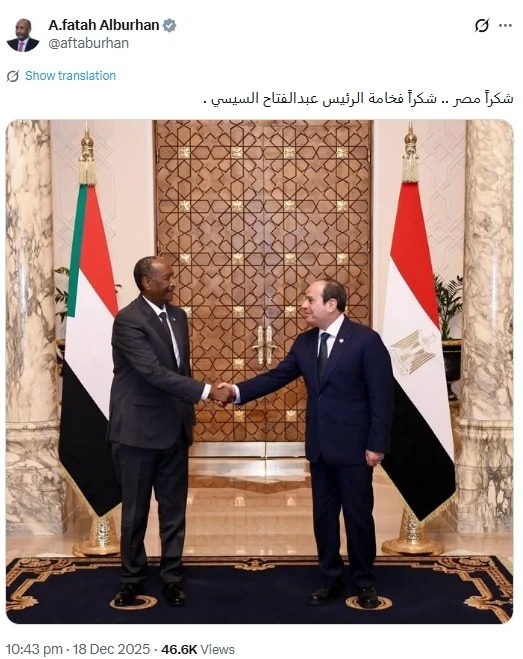 وعلق البرهان على الصورة قائلاً «شكراً مصر.. شكراً فخامة الرئيس عبدالفتاح السيسي»، في إشارة إلى العلاقات التاريخية والأخوية بين البلدين، ودور مصر في دعم جهود السودان في مختلف المجالات الإقليمية والسياسية.