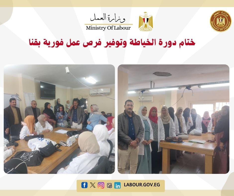 اختتمت مديرية عمل قنا دورة الخياطة بالوحدة الثابتة لـ 15 متدربة. وشهد الختام التزام "مؤسسة الندى للصناعات التكاملية" بتوفير فرص عمل مباشرة للمتدربات بمصنع الملابس التابع لها، تأكيداً على تكامل منظومة التدريب مع احتياجات سوق العمل الفعلية.