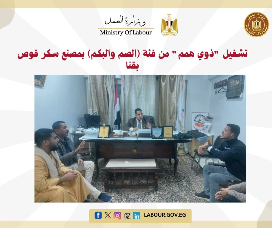 استقبل أحمد محمد معوض، مدير مديرية عمل قنا، حالتين من ذوي الهمم (صم وبكم) مرشحين من المحافظة، ووجه بتشغيلهم فوراً بإحدى الشركات الخدمية التابعة لمصنع سكر قوص، مع مراعاة قرب العمل من محل إقامتهم، تنفيذاً لنسبة الـ 5% المقررة قانوناً.