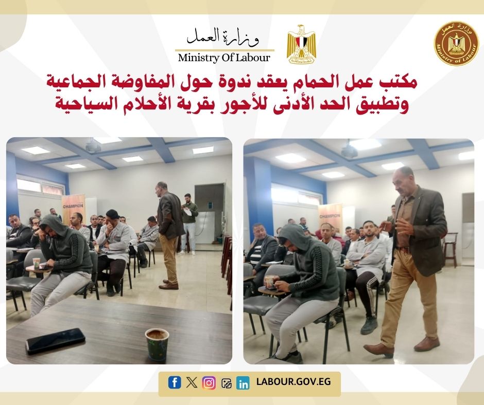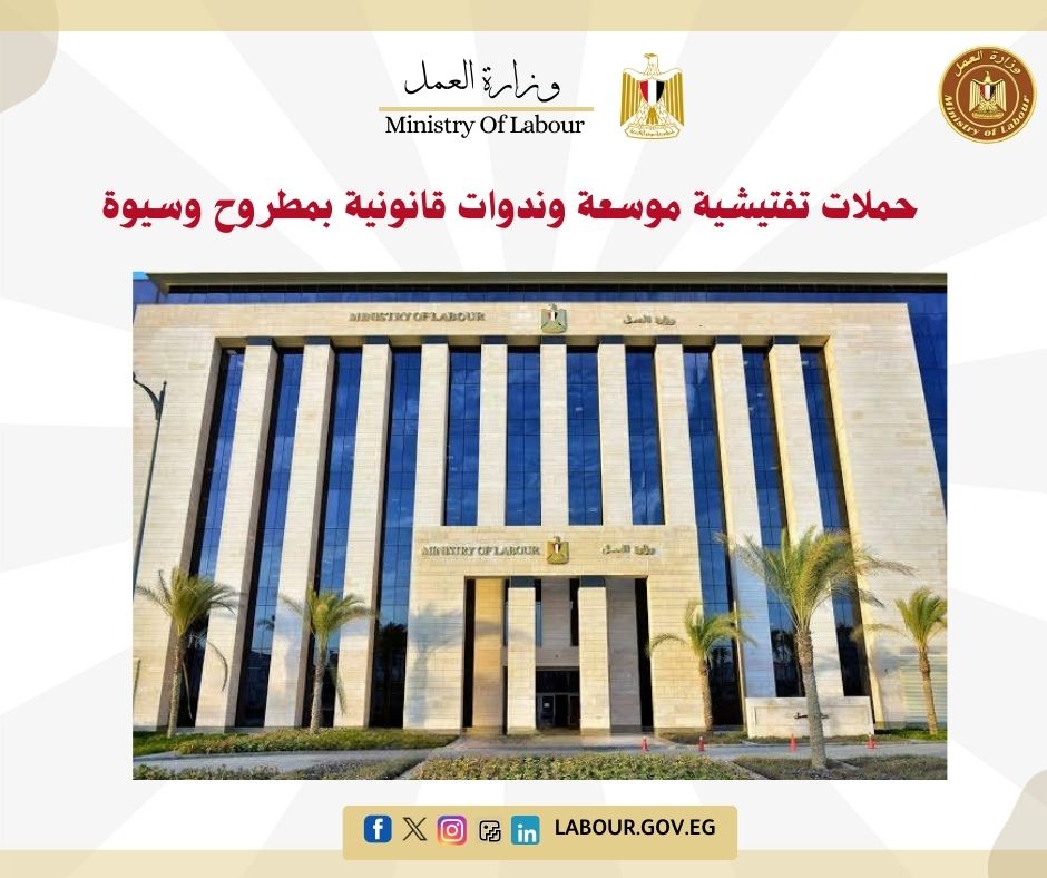 واصلت مديرية عمل مطروح حملاتها التفتيشية في (مرسى مطروح، الحمام، العلمين، الضبعة، وسيوة). شملت الحملات المخابز والمولات والمنشآت السياحية للتأكد من الحد الأدنى للأجور وعقود العمل. كما نظم مكتب الحمام ندوة بشركة "مودرن جاس" حول مستجدات قانون العمل لتعزيز الوعي القانوني.