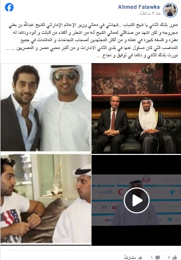 نشر الفنان أحمد فلوكس صورًا تجمعه برئيس المكتب الوطني للإعلام بدولة الإمارات الشيخ عبد الله بن بطي آل حامد، عبر صفحته الرسمية على موقع التواصل الاجتماعي فيس بوك، وذلك خلال زيارة الوزير إلى مصر.
