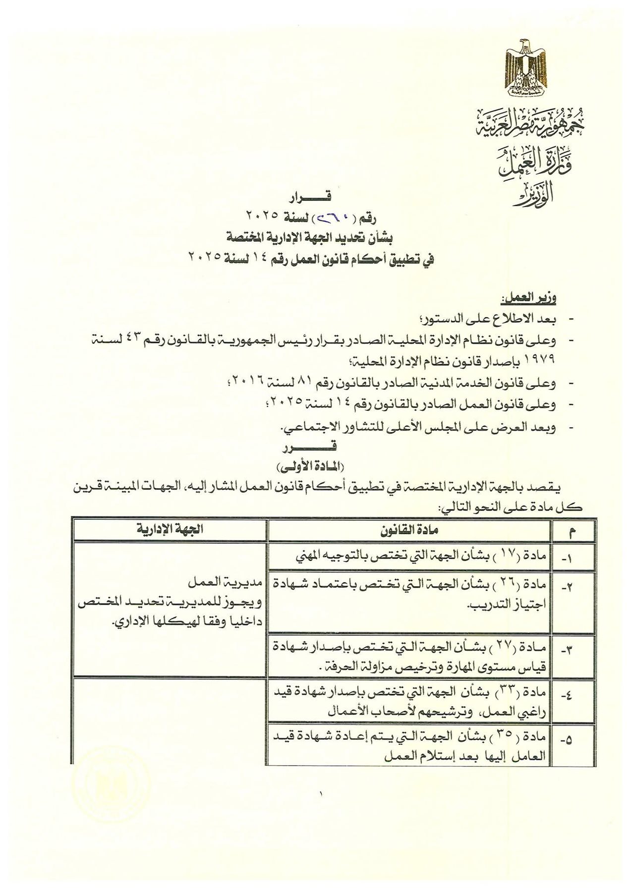 تفاصيل القرار الوزاري رقم (260) لسنة 2025 بشأن تحديد الجهة الإدارية المختصة في تطبيق أحكام قانون العمل رقم 14 لسنة 2025