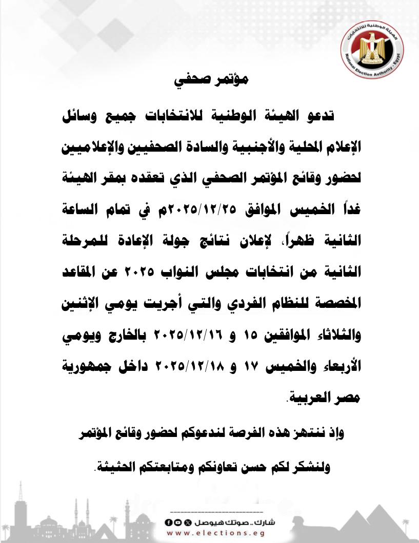 تستعد الهيئة الوطنية للانتخابات للكشف عن النتائج النهائية لجولة الإعادة في المرحلة الثانية لانتخابات مجلس النواب 2025، وذلك خلال مؤتمر صحفي عالمي بمقر الهيئة غداً الخميس الموافق 25 ديسمبر 2025، في تمام الساعة الثانية ظهراً.