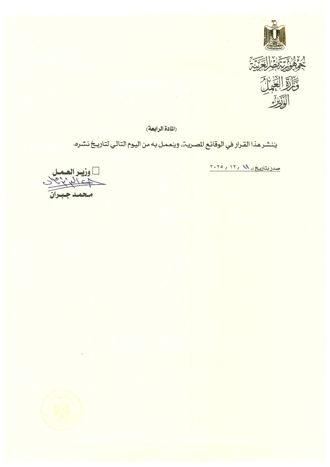في إطار الاستمرار في نشر القرارات التنفيذية لقانون العمل الجديد، أعلن وزير العمل محمد جبران،اليوم الاربعاء عن صدور القرار الوزاري رقم (269) لسنة 2025، بشأن إنشاء وتحديث قواعد بيانات مركزية لسوق العمل، وذلك تنفيذًا لأحكام قانون العمل رقم 14 لسنة 2025، وفي ضوء الدستور، والاتفاقيات الدولية التي صدّقت عليها جمهورية مصر العربية، وبعد العرض على المجلس الأعلى للتشاور الاجتماعي.