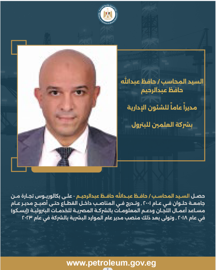أصدر المهندس كريم بدوي وزير البترول والثروة المعدنية قرارا بتكليف المحاسب حافظ عبد الله حافظ عبد الرحيم بمنصب مدير عام للشئون الإدارية بشركة العلمين للبترول.