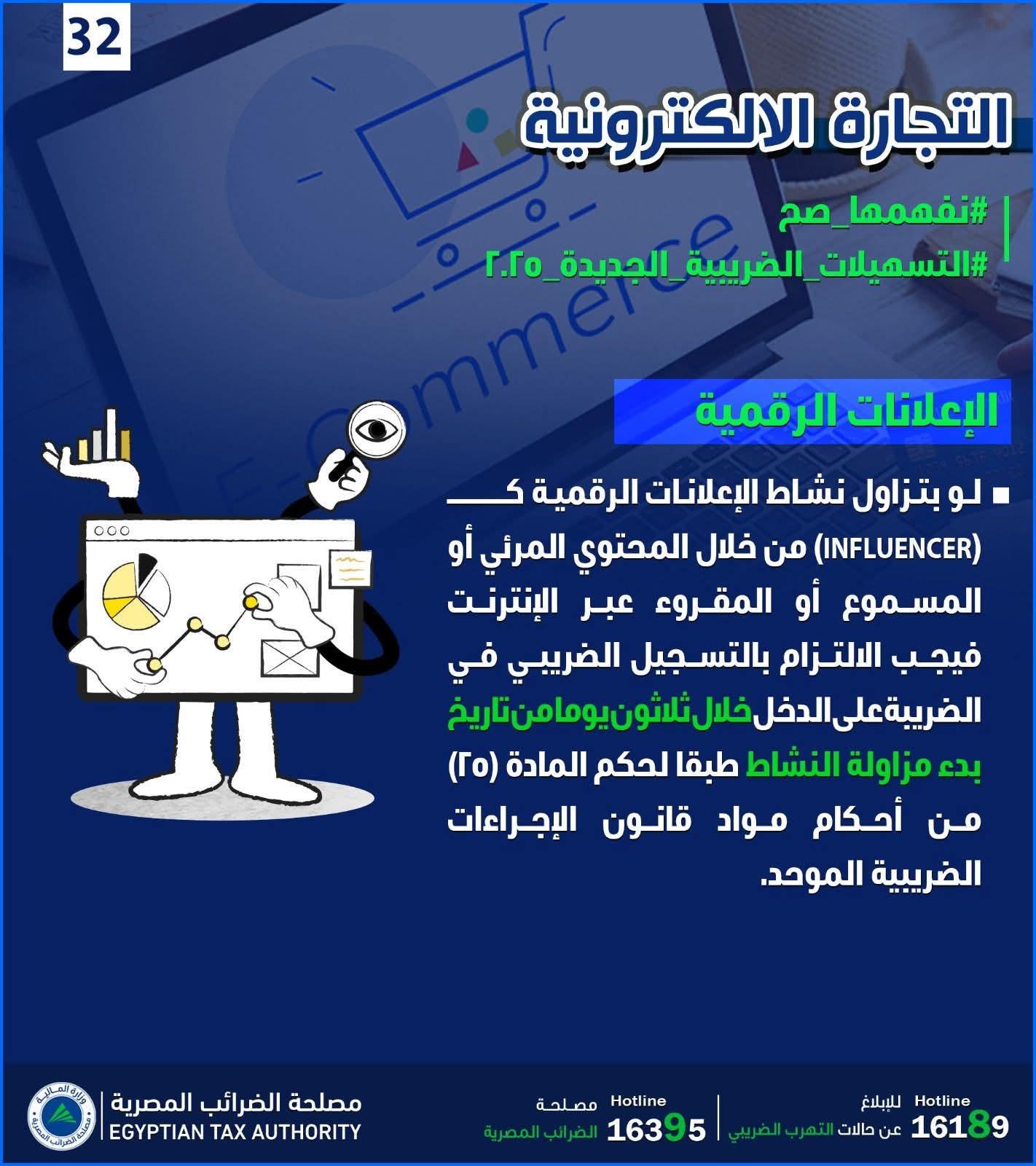 أصدرت مصلحة الضرائب المصرية إنفوجرافا اليوم، حول الإعلانات الرقمية. وأوضح الإنفوجراف أنه يجب على من يزاول نشاط الإعلانات الرقمية كـ (انفلونسر) من خلال المحتوى المرئي أو المسموع أو المقروء عبر الإنترنت، الالتزام بالتسجيل الضريبي في الضريبة على الدخل خلال ٣٠ يوما من تاريخ بدء مزاولة النشاط، طبقا لحكم المادة (25) من أحكام مواد قانون الإجراءات الضريبية الموحد.