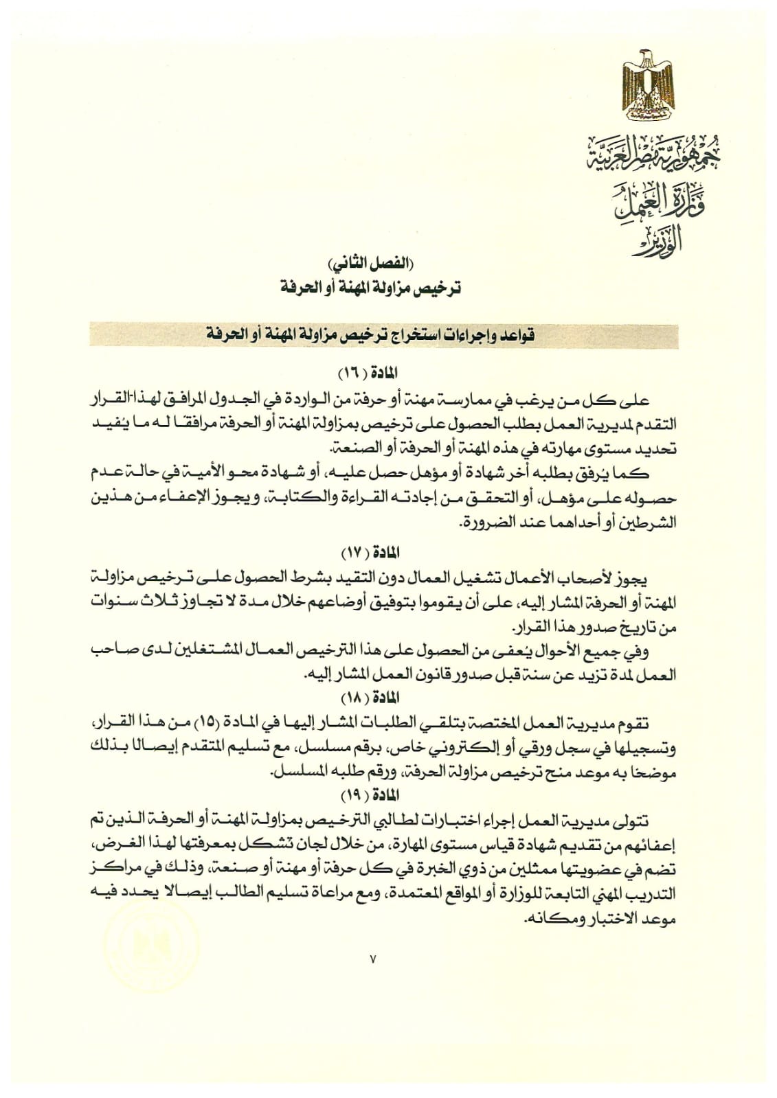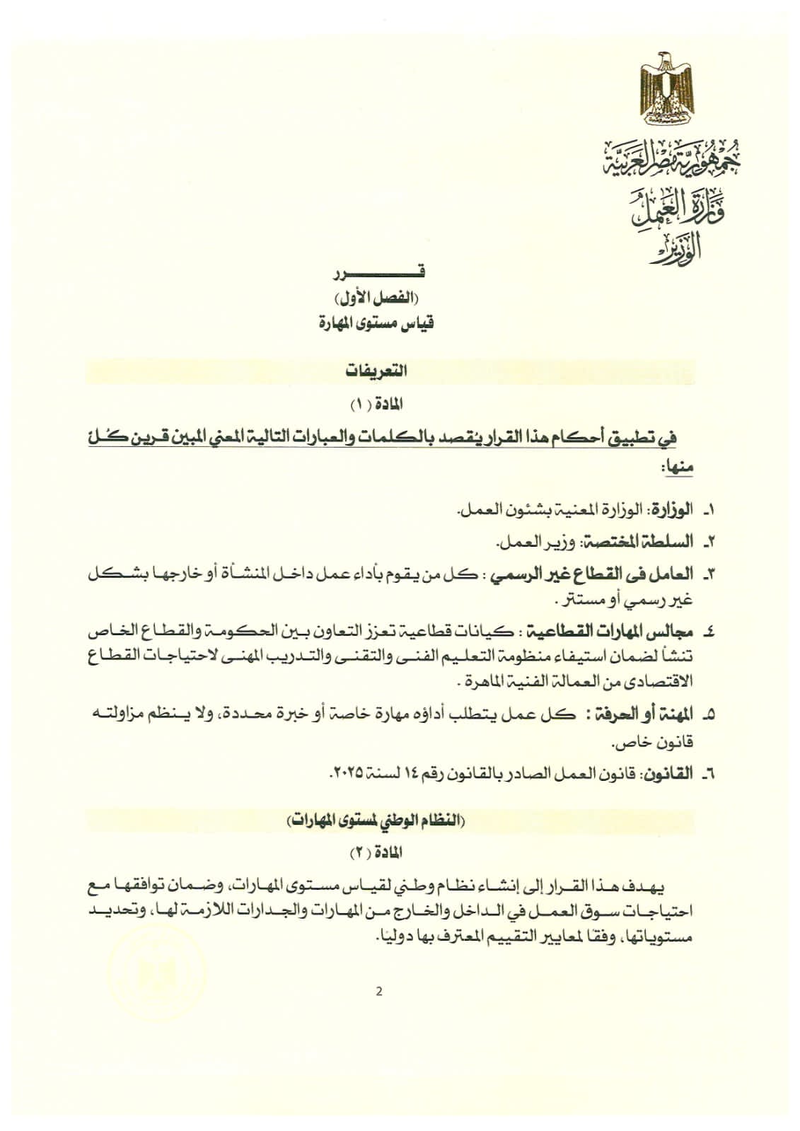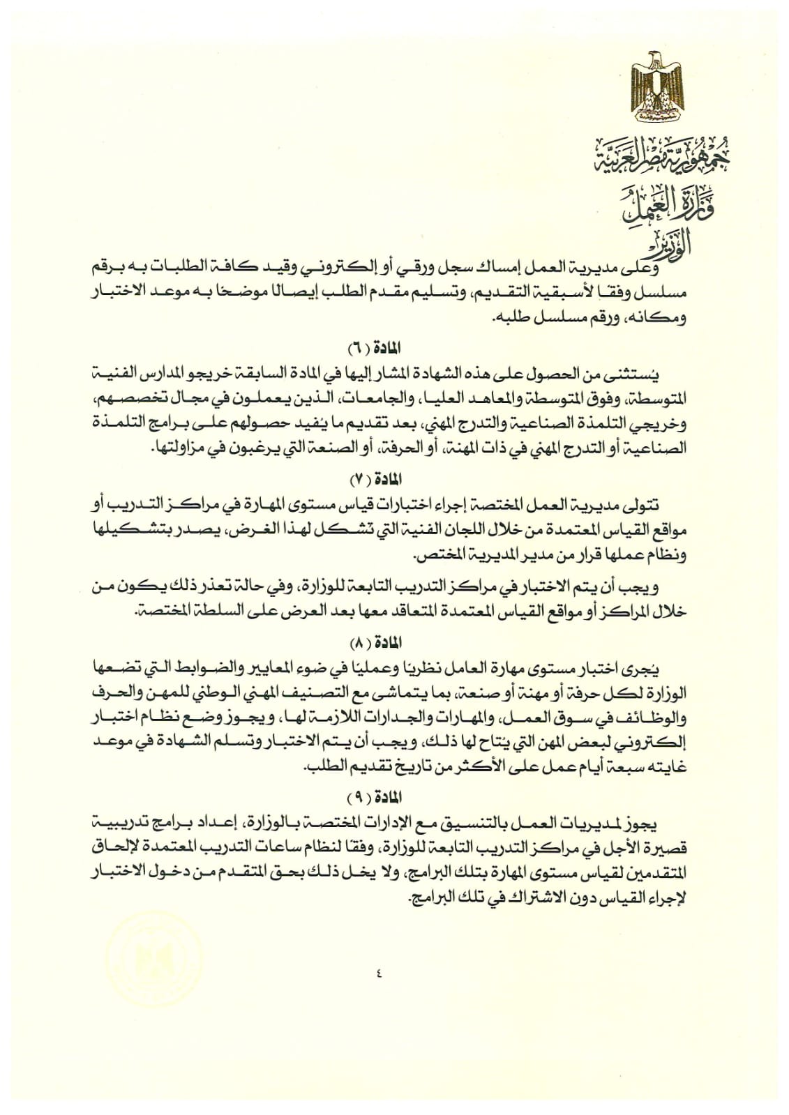 يلتزم كل من يرغب في ممارسة حرفة أو مهنة أو صنعة من الحرف أو المهن المبينة بالجدول المرافق لهذا القرار أن يتقدم بطلب إلى مديرية العمل المختصة لإجراء اختبارات للحصول على شهادة قياس مستوى المهارة وفقًا للضوابط التي تضعها الوزارة.