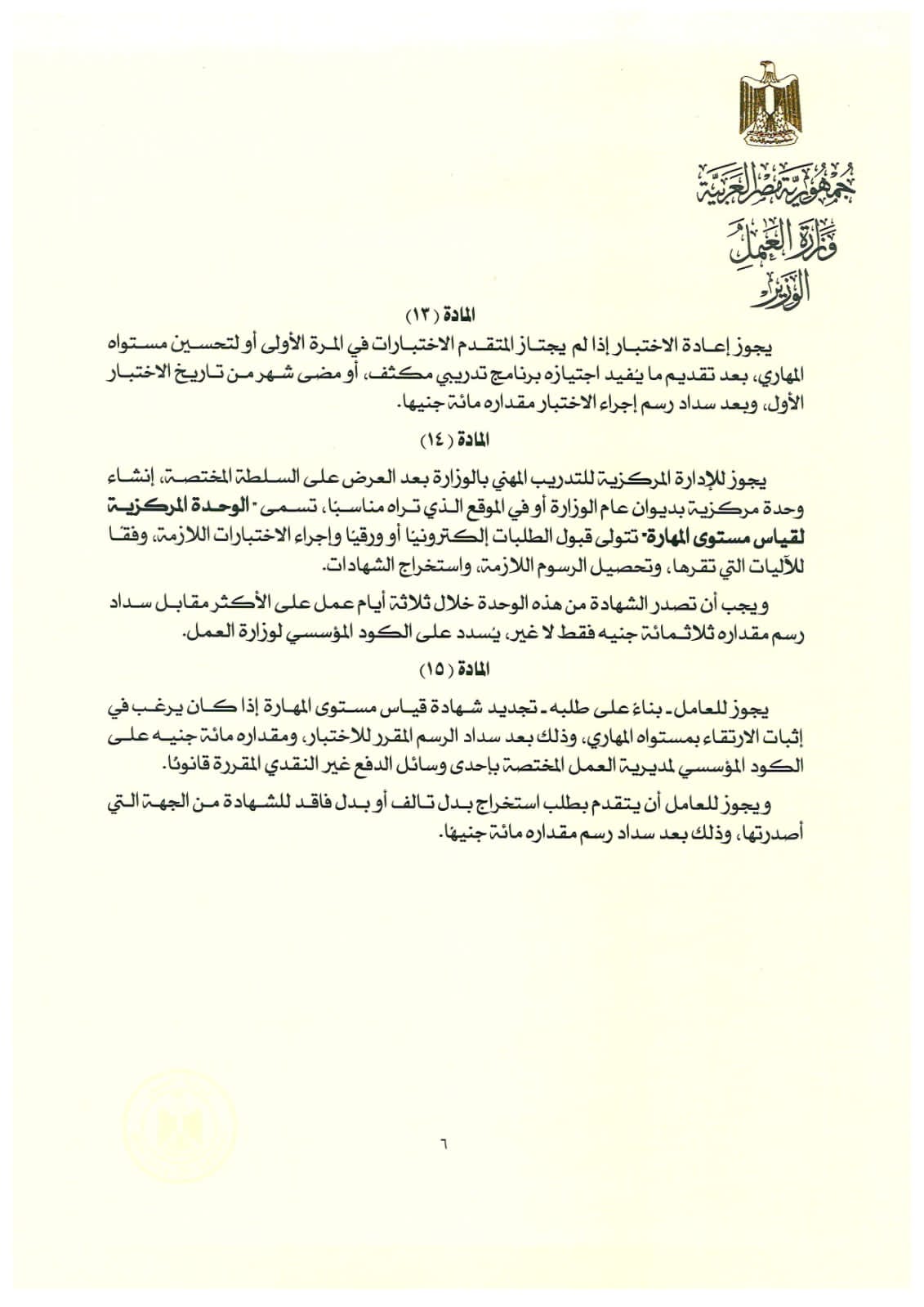 يجوز للعامل - بناءً على طلبه - تجديد شهادة قياس مستوى المهارة إذا كان يرغب في إثبات الارتقاء بمستواه المهاري، وذلك بعد سداد الرسم المقرر للاختبار، ومقداره مائة جنيه على الكود المؤسسي لمديرية العمل المختصة بإحدى وسائل الدفع غير النقدي المقررة قانونًا.