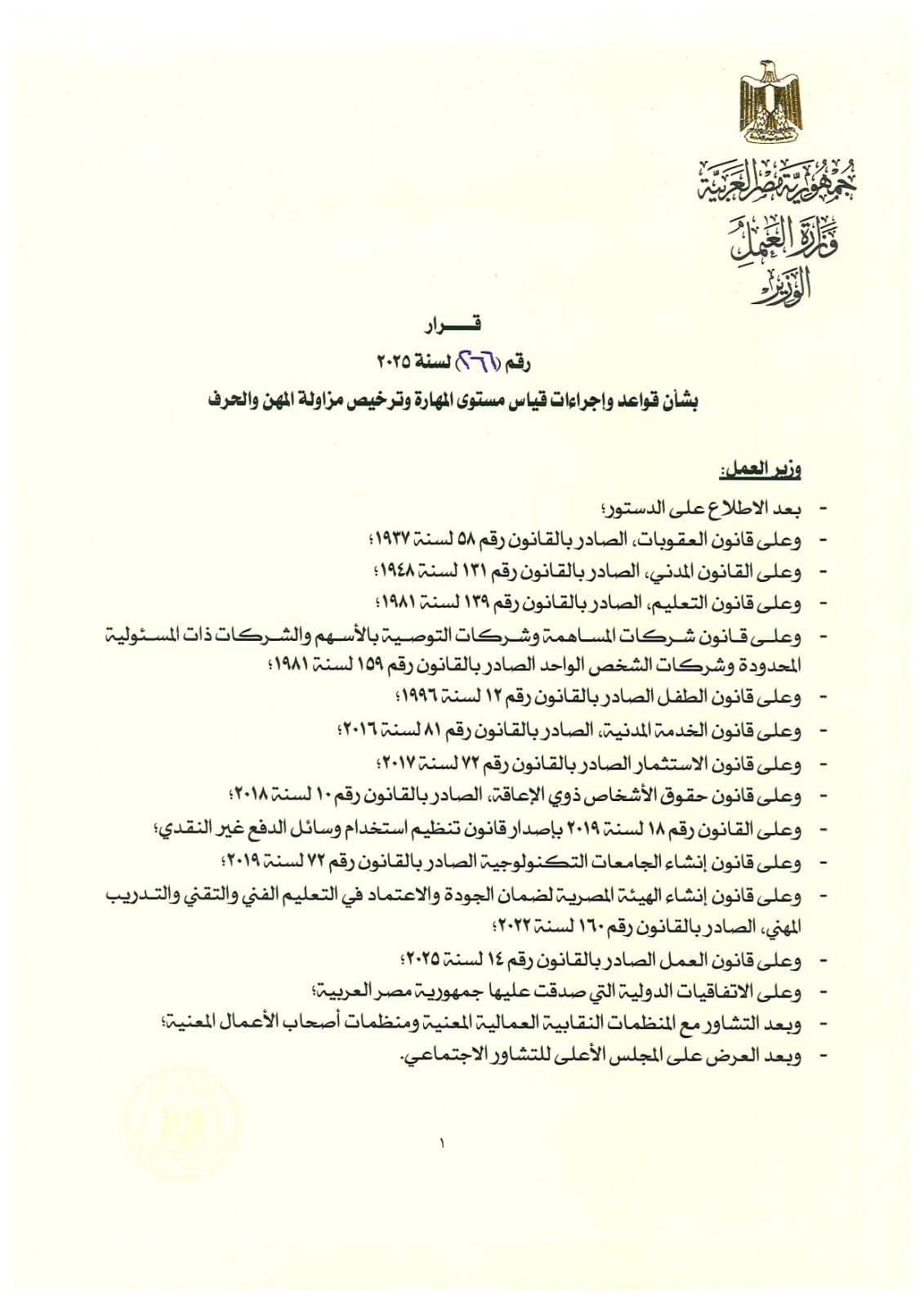 ...بعد الاطلاع على الدستور.. وعلى قانون العقوبات، الصادر بالقانون رقم 58 لسنة 1937،وعلى القانون المدني، الصادر بالقانون رقم (131) لسنة 1948..وعلى قانون التعليم، الصادر بالقانون رقم 139 لسنة 1981..وعلى قانون شركات المساهمة وشركات التوصية بالأسهم والشركات ذات المسئولية المحدودة وشركات الشخص الواحد الصادر بالقانون رقم 159 لسنة 1981..وعلى قانون الطفل الصادر بالقانون رقم 12 لسنة 1996.. وعلى قانون الخدمة المدنية، الصادر بالقانون رقم 81 لسنة 2016.. وعلى قانون الاستثمار الصادر بالقانون رقم 72 لسنة 2017.. وعلى قانون حقوق الأشخاص ذوي الإعاقة، الصادر بالقانون رقم 10 لسنة 2018..وعلى القانون رقم 18 لسنة 2019 بإصدار قانون تنظيم استخدام وسائل الدفع غير النقدي..وعلى قانون إنشاء الجامعات التكنولوجية الصادر بالقانون رقم 72 لسنة 2019..وعلى قانون إنشاء الهيئة المصرية لضمان الجودة والاعتماد في التعليم الفني والتقني والتدريب المهني، الصادر بالقانون رقم 160 لسنة 2022..وعلى قانون العمل الصادر بالقانون رقم 14 لسنة 2025..وعلى الاتفاقيات الدولية التي صدقت عليها جمهورية مصر العربية..وبعد التشاور مع المنظمات النقابية العمالية المعنية ومنظمات أصحاب الأعمال المعنية..وبعد العرض على المجلس الأعلى للتشاور الاجتماعي..