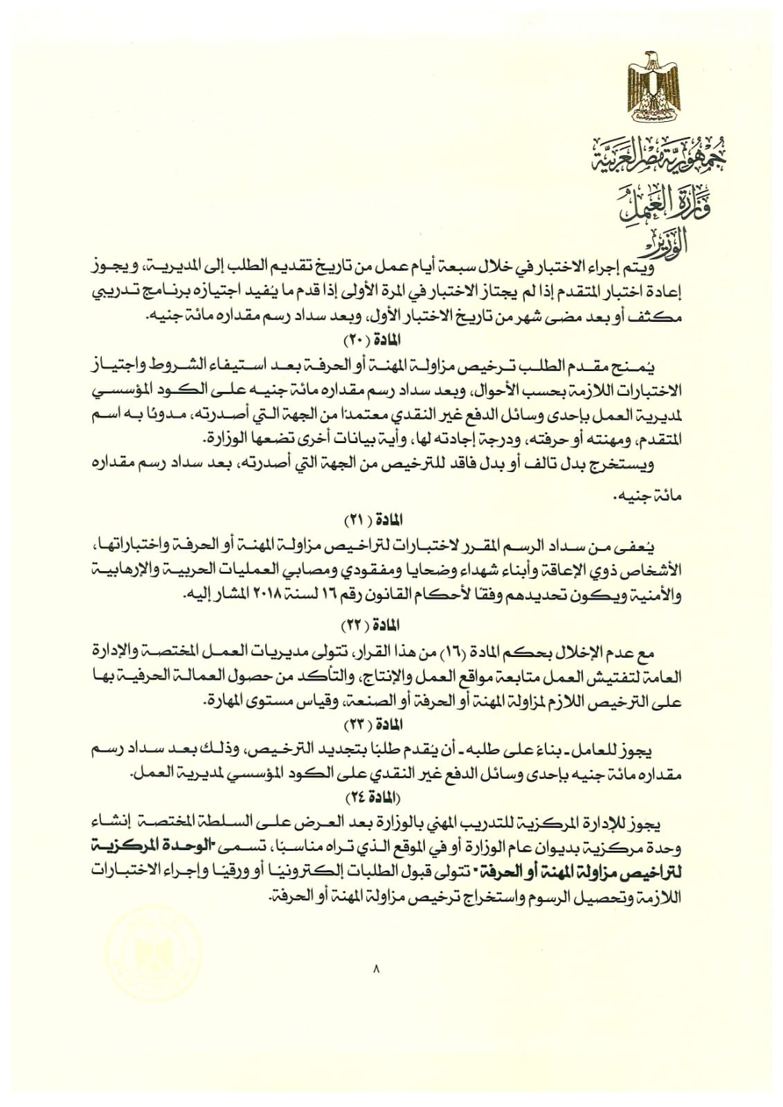 يُمنح مقدم الطلب ترخيص مزاولة المهنة أو الحرفة بعد استيفاء الشروط واجتياز الاختبارات اللازمة بحسب الأحوال، وبعد سداد رسم مقداره مائة جنيه على الكود المؤسسي لمديرية العمل بإحدى وسائل الدفع غير النقدي معتمدًا من الجهة التي أصدرته، مدونًا به اسم المتقدم، ومهنته أو حرفته، ودرجة إجادته لها، وأية بيانات أخرى تضعها الوزارة.