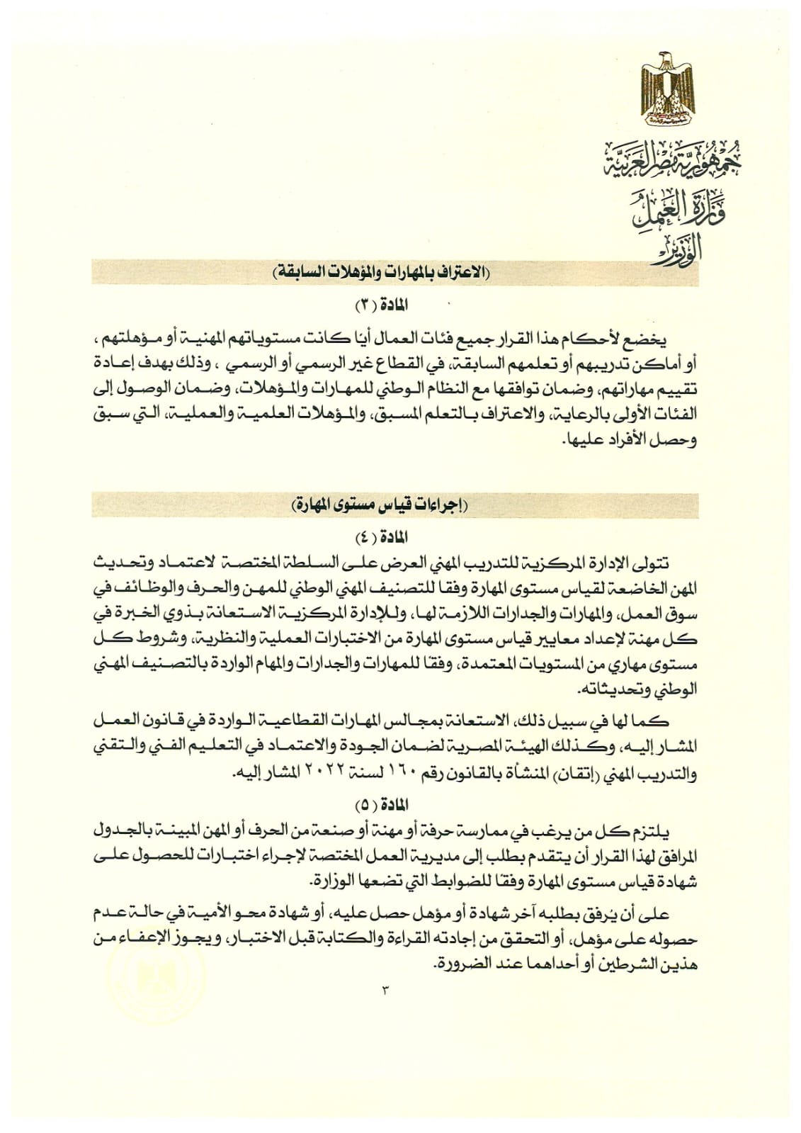 وأكد وزير العمل أن القرار يأتي استنادًا إلى أحكام الدستور، وقانون العمل الجديد، وعدد من القوانين المنظمة ذات الصلة، واتفاقيات منظمة العمل الدولية التي صدقت عليها جمهورية مصر العربية، وبعد التشاور مع المنظمات النقابية للعاملين العمالية ومنظمات أصحاب الأعمال، والعرض على المجلس الأعلى للتشاور الاجتماعي، بما يضمن التوازن بين متطلبات سوق العمل وحقوق العاملين...وأوضح الوزير أن القرار يستهدف الاعتراف بالتعلم المسبق والخبرات العملية، سواء في القطاع الرسمي أو غير الرسمي، وإعادة تقييم المهارات وفقًا لمعايير وطنية معترف بها دوليًا، بما يسهم في دمج العمالة غير المنتظمة، وتوسيع قاعدة المستفيدين من خدمات التدريب والاعتماد المهني، خاصة الفئات الأولى بالرعاية.