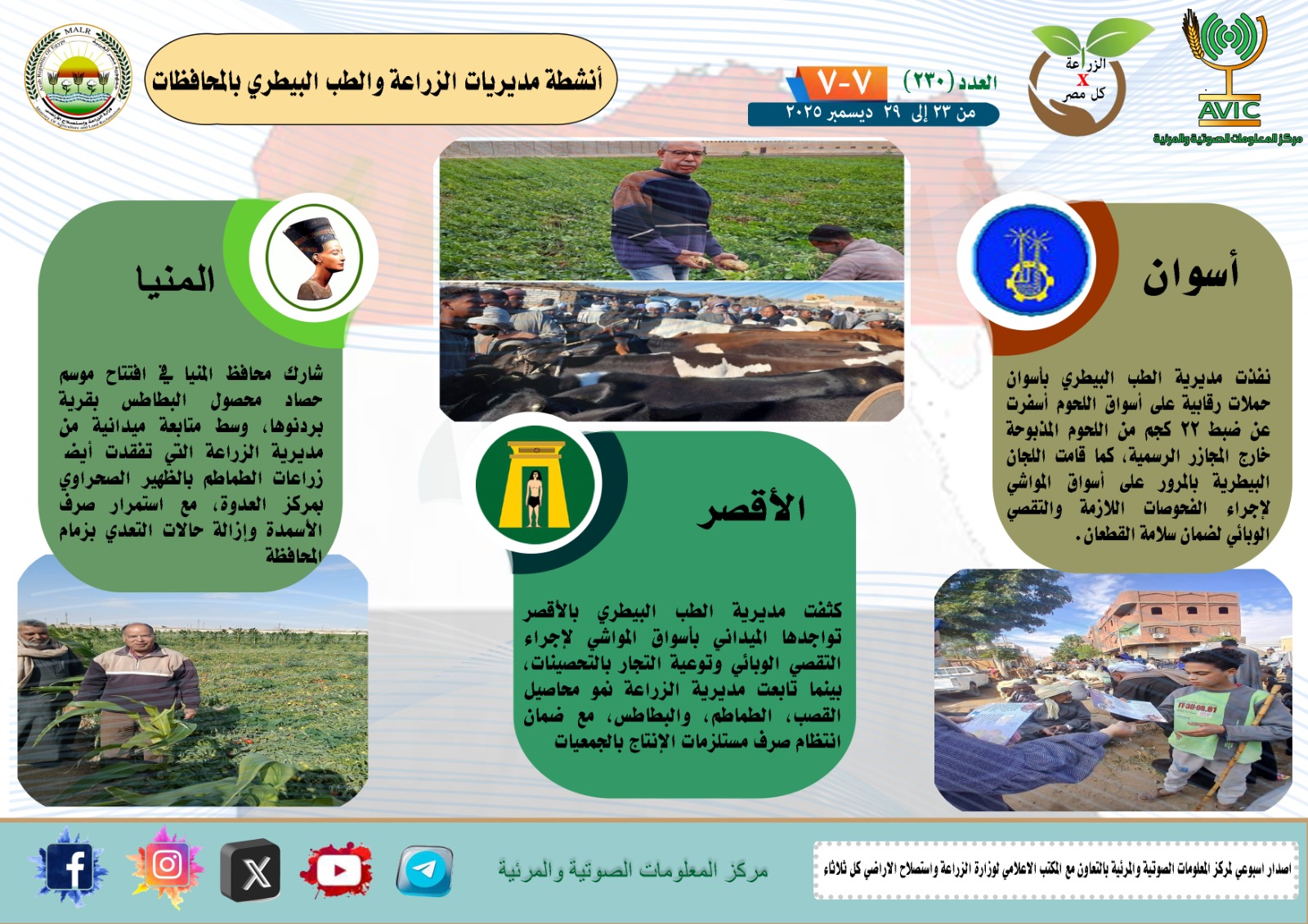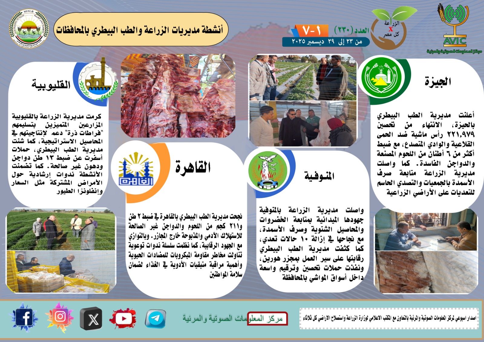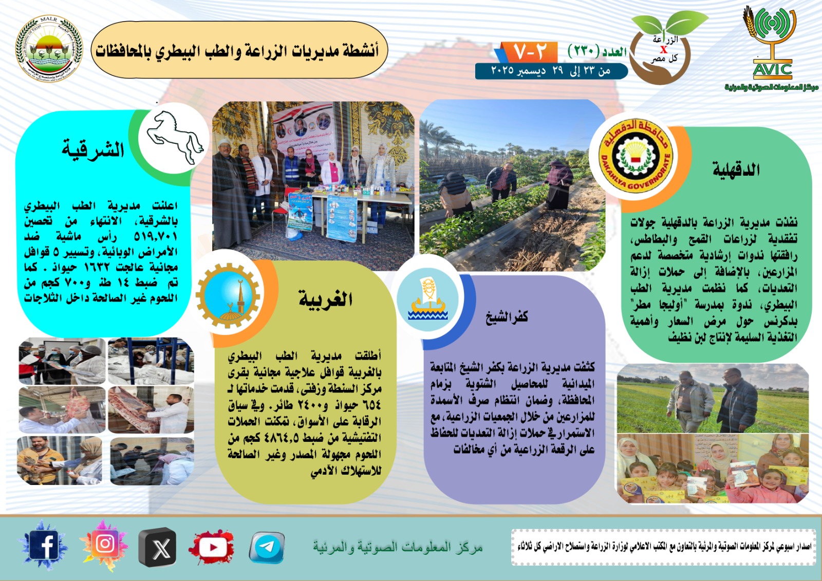 أصدر مركز المعلومات الصوتية والمرئية التابع لوزارة الزراعة واستصلاح الأراضي، والمكتب الاعلامي للوزارة، العدد رقم 230 من اصدار: "الزراعة في كل مصر" بالانفوجراف والفيديو، يوضح الجهود والانشطة التي تقوم بها مديريات الزراعة والطب البيطري بمحافظات الجمهورية خلال الفترة من 23 إلى 29 ديسمبر الجاري
