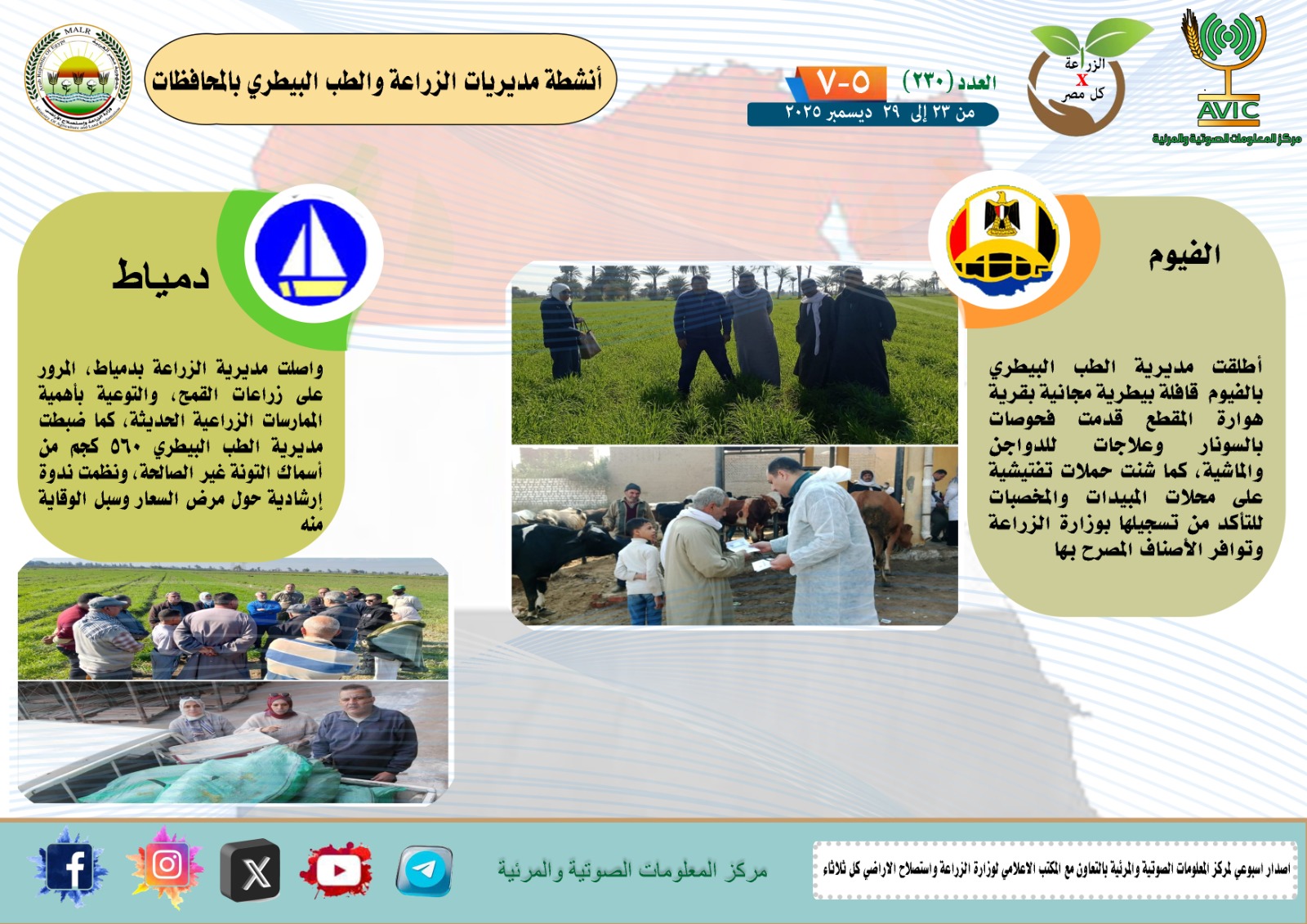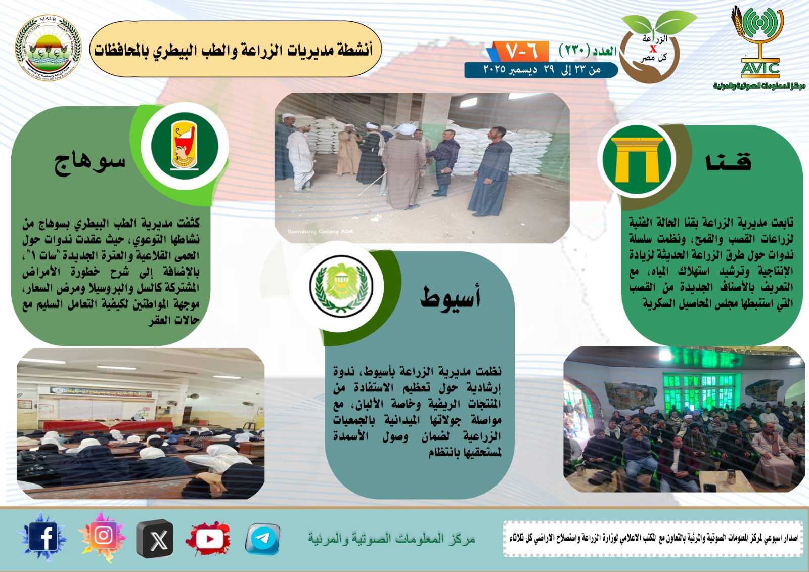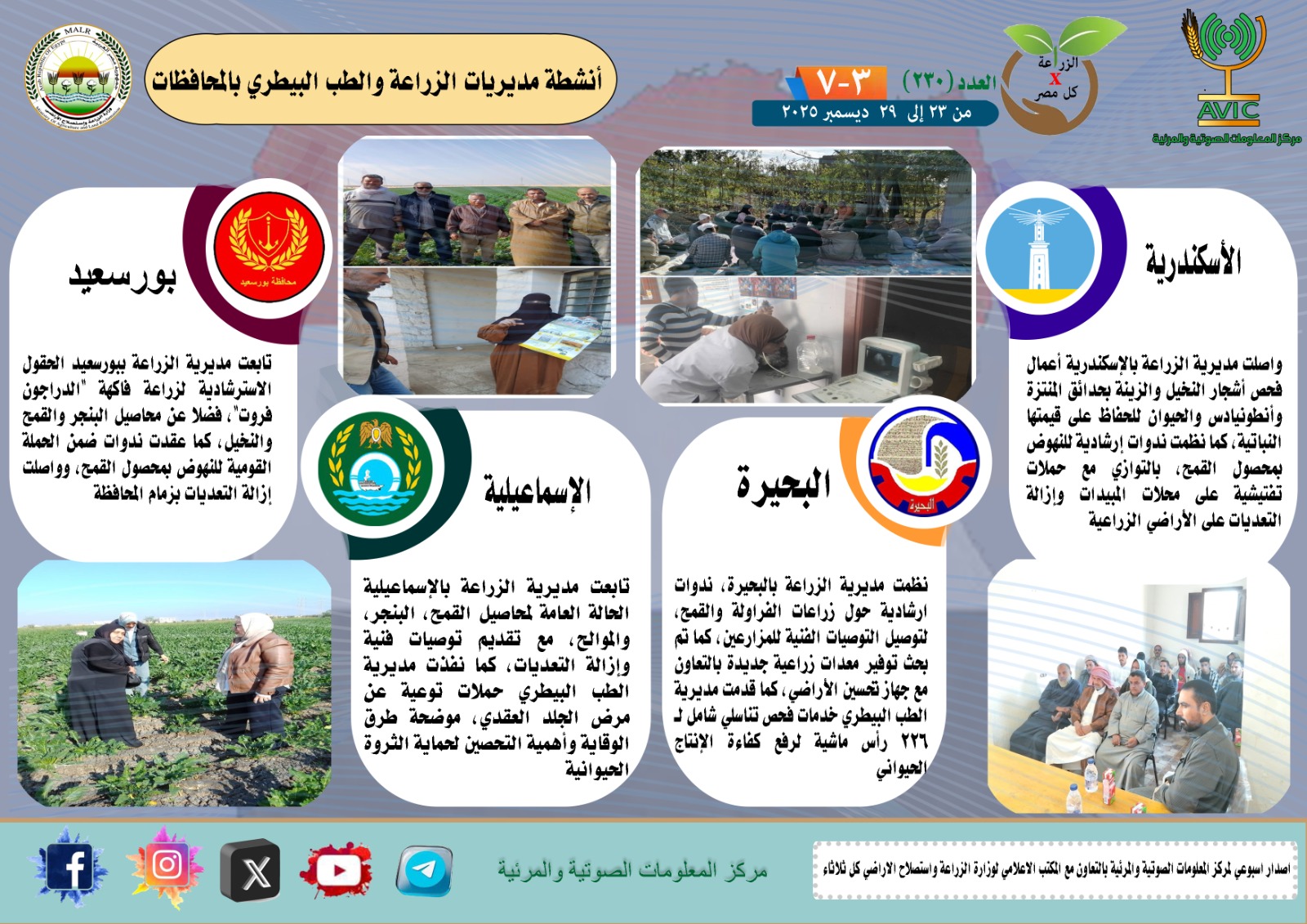 أصدر مركز المعلومات الصوتية والمرئية التابع لوزارة الزراعة واستصلاح الأراضي، والمكتب الاعلامي للوزارة، العدد رقم 230 من اصدار: "الزراعة في كل مصر" بالانفوجراف والفيديو، يوضح الجهود والانشطة التي تقوم بها مديريات الزراعة والطب البيطري بمحافظات الجمهورية خلال الفترة من 23 إلى 29 ديسمبر الجاري