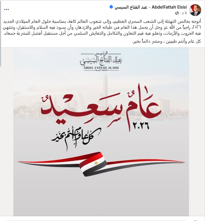 توجه الرئيس عبد الفتاح السيسى، بخالص التهنئة إلى الشعب المصري العظيم، وإلى شعوب العالم كافة، بمناسبة حلول العام الميلادي الجديد 2026.