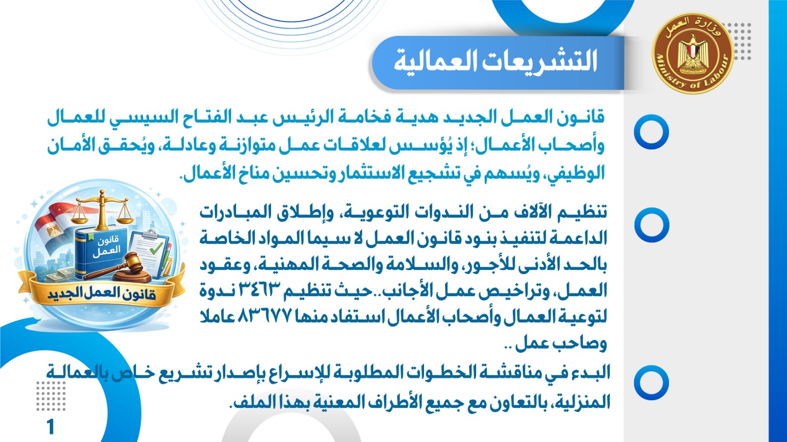 تنظيم الآلاف من الندوات التوعوية، وإطلاق المبادرات الداعمة لتنفيذ بنود قانون العمل لا سيما المواد الخاصة بالحد الأدنى للأجور، والسلامة والصحة المهنية، وعقود العمل، وتراخيص عمل الأجانب..حيث تنظيم 3463 ندوة لتوعية العمال وأصحاب الأعمال استفاد منها 83677 عاملا وصاحب عمل ..