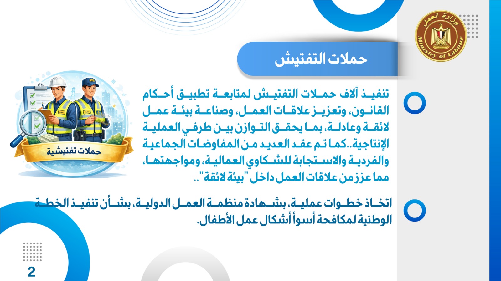 تنفيذ آلاف حملات التفتيش لمتابعة تطبيق أحكام القانون، وتعزيز علاقات العمل، وصناعة بيئة عمل لائقة وعادلة، بما يحقق التوازن بين طرفي العملية الإنتاجية..كما تم عقد العديد من المفاوضات الجماعية والفردية والاستجابة للشكاوي العمالية، ومواجهتها،مما عزز من علاقات العمل داخل "بيئة لائقة"..