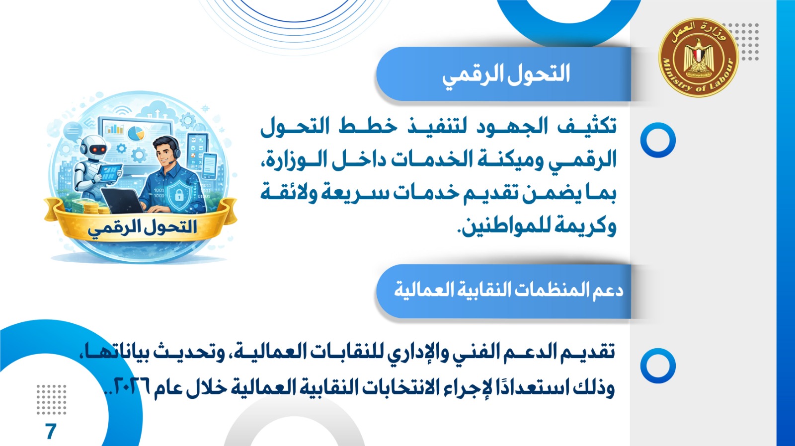 تقديم الدعم الفني والإداري للنقابات العمالية، وتحديث بياناتها، وذلك استعدادًا لإجراء الانتخابات النقابية العمالية خلال عام 2026..