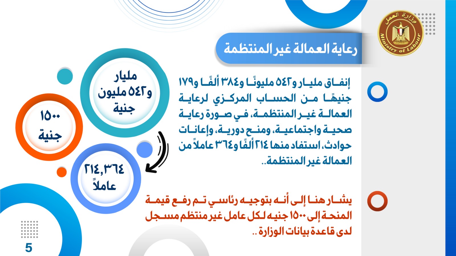 إنفاق مليار و542 مليونًا و384 ألفًا و179 جنيهًا من الحساب المركزي لرعاية العمالة غير المنتظمة، في صورة رعاية صحية واجتماعية، ومنح دورية، وإعانات حوادث، استفاد منها 214 ألفًا و364 عاملًا من العمالة غير المنتظمة..يشار هنا إلى أنه بتوجيه رئاسي تم رفع قيمة المنحة إلى 1500 جنيه لكل عامل غير منتظم مسجل لدى قاعدة بيانات الوزارة .